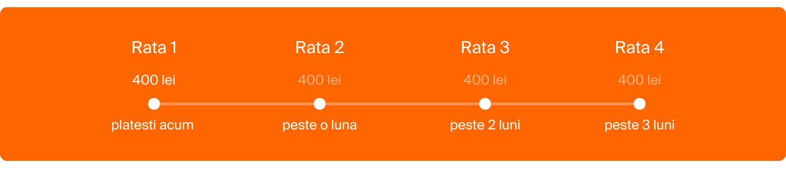 Pentru cumparaturi de pana in 2.000 lei, iti oferim posibilitatea de a le achita in 4 rate fixe, cu urmatoarele beneficii: