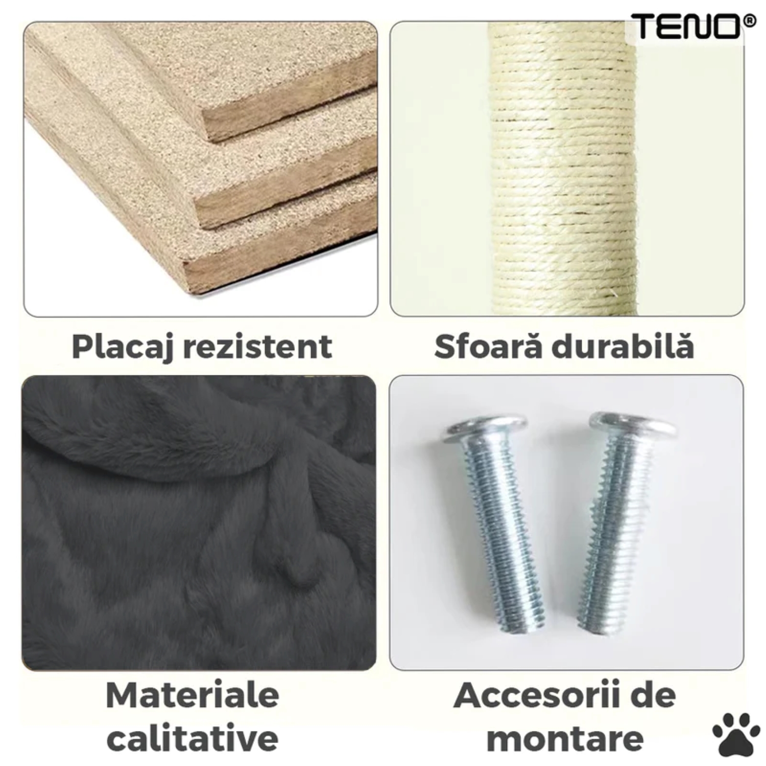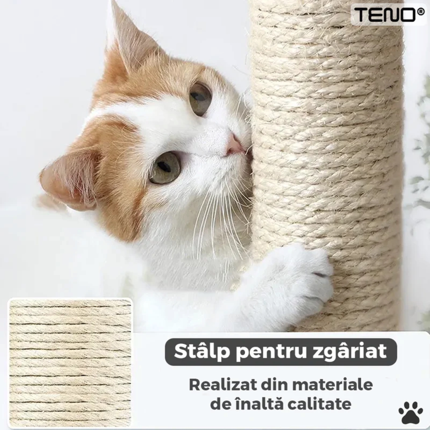 - Stalpi pentru zgâriat: Stalpii acoperiți cu sisal natural satisfac nevoia naturală a pisicii de a-și ascuți ghearele, protejând astfel mobilierul tău.