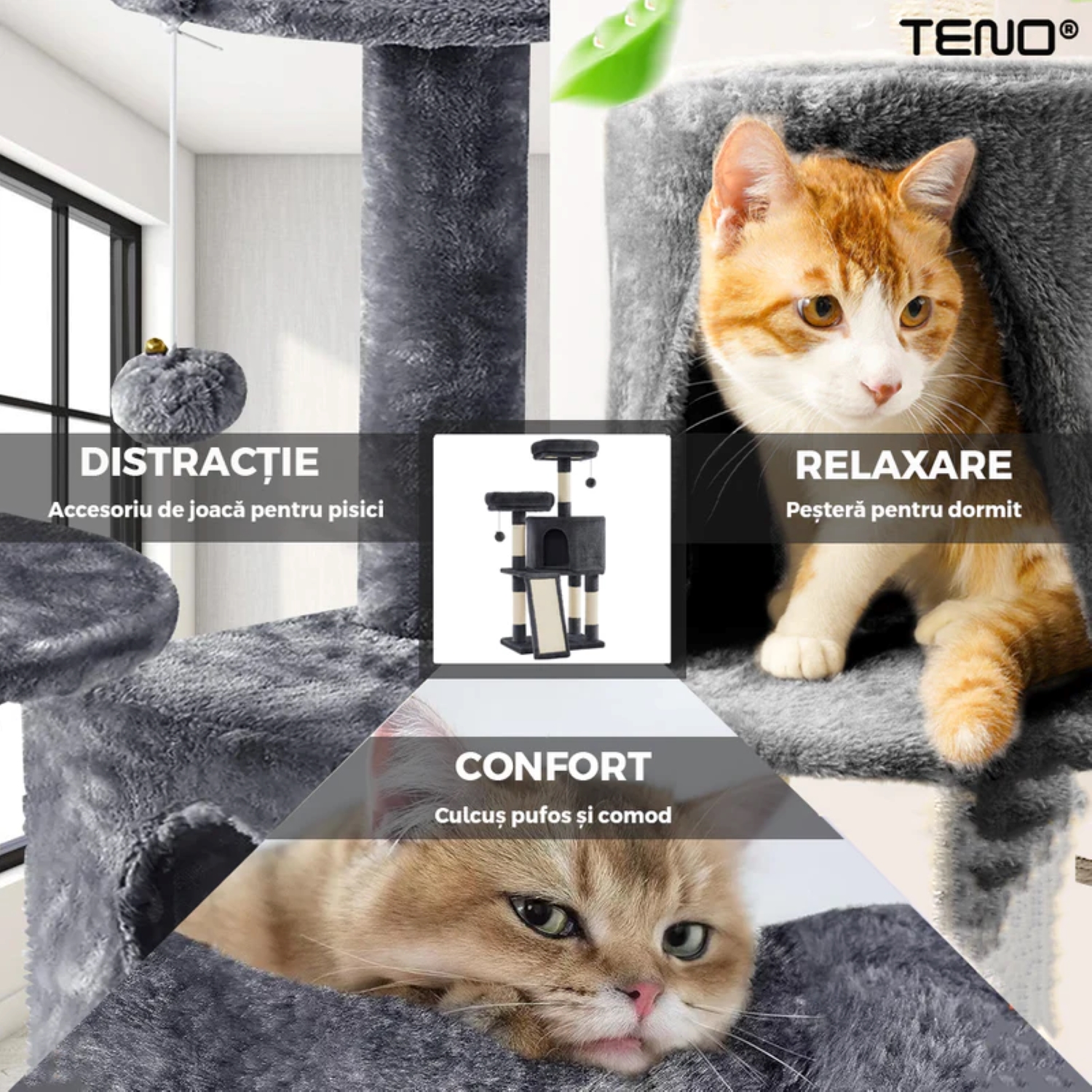 - Turn multi-nivel: Cu 3 niveluri, acest ansamblu oferă pisicii tale multiple puncte de observație și explorare, stimulând instinctul său natural de cățărare.