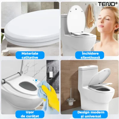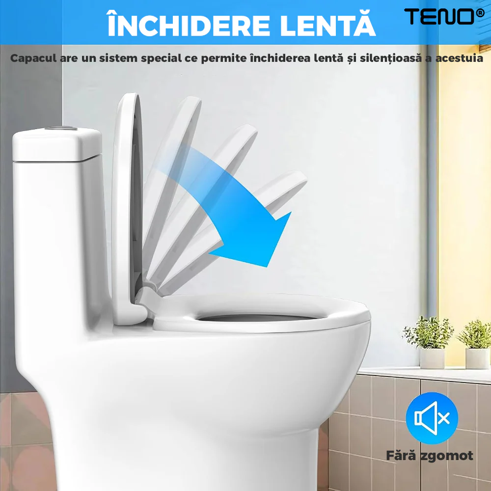 Capacul și reductorul Teno124 sunt echipate cu un mecanism de închidere lentă, ceea ce înseamnă că ambele se închid treptat și silențios, eliminând riscul de zgomote bruște sau de închidere violentă. Această funcționalitate este extrem de practică pentru familiile cu copii mici, deoarece previne accidentările prin prinderea degetelor și asigură o utilizare lină. Închiderea lentă sporește durabilitatea capacului, protejându-l de uzura prematură și oferind o experiență confortabilă pentru toți utilizatorii.