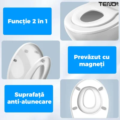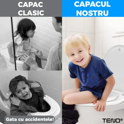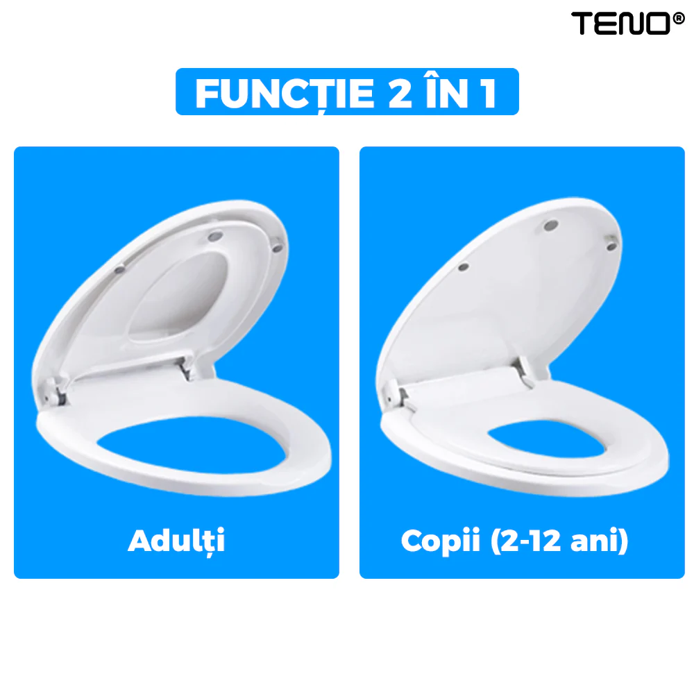 Capacul Teno124 integrează un reductor special pentru copii, care se adaptează perfect nevoilor acestora. Reductorul poate fi utilizat ușor de către copiii mici, oferindu-le o suprafață mai mică și confortabilă. De asemenea, capacul mare este ideal pentru utilizarea de către adulți, oferind o soluție practică pentru întreaga familie, fără a necesita înlocuirea capacului de fiecare dată.