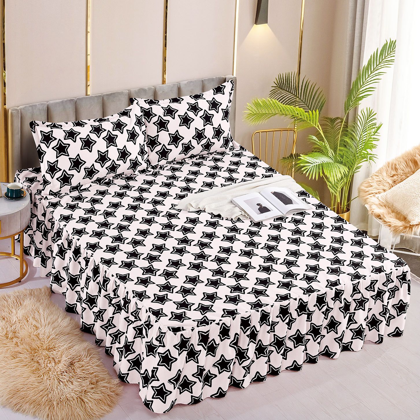 Cearsaf de Pat cu Volanase + 2 Fete Perna, Bumbac Finet, Stele Negre, Alb, J10629