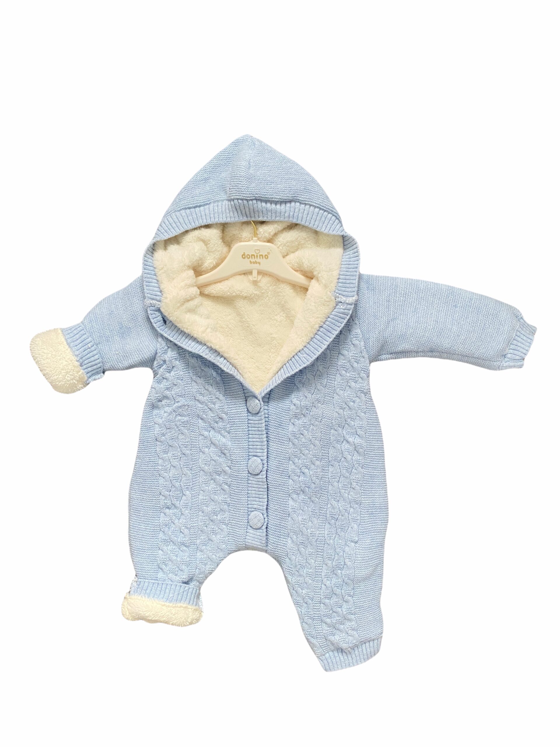 Combinezon crosetat cu interior cocolino, super pufos, finut la purtare. Combinezonul este prevazut cu gluga, deschidere in nasturi, in partea din fata.