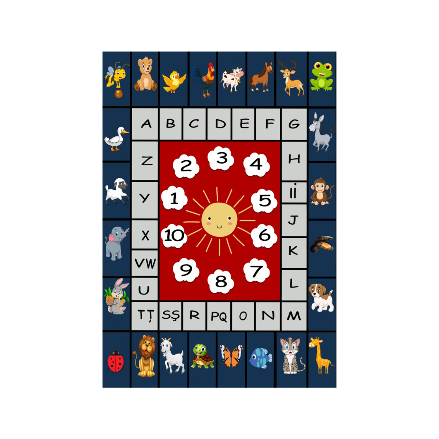 Covor Educativ Copii, Model Alfabet/Animale/Numere, Albastru/Rosu/Gri, Antiderapant