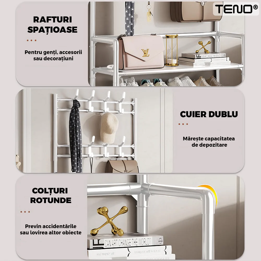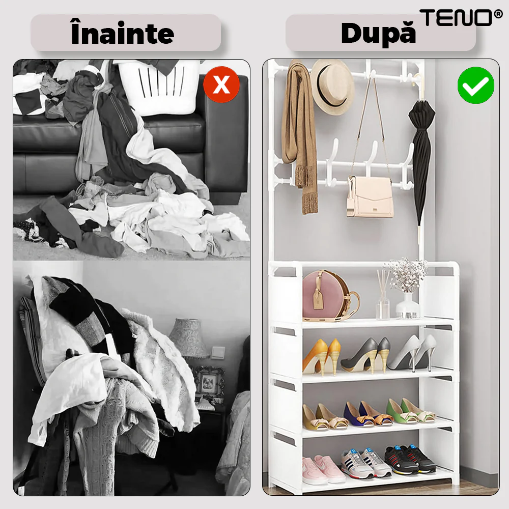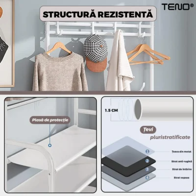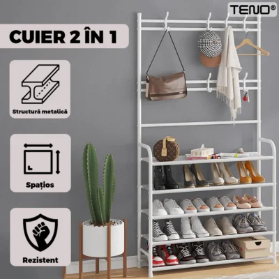 Cuierul Teno1127 oferă un spațiu generos pentru depozitarea mai multor articole de îmbrăcăminte și încălțăminte, fiind ideal pentru familii sau pentru persoane care au o colecție mai mare de haine și pantofi. Combinația de cuier și pantofar permite economisirea spațiului în locuință, având în vedere că ambele funcții sunt integrate într-un singur produs compact.