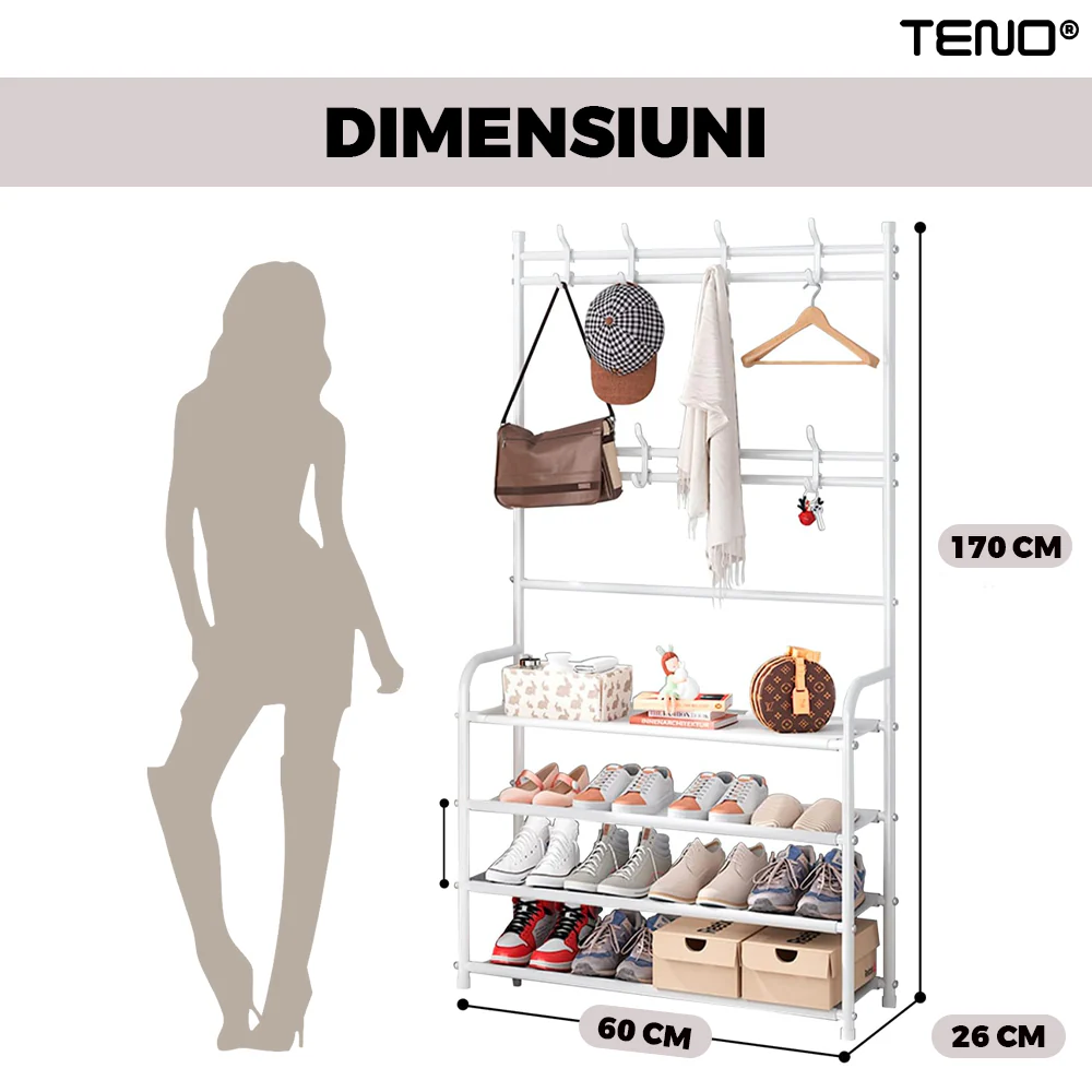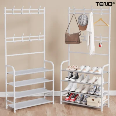 Cuierul pentru haine Teno1127 este o soluție modernă și funcțională pentru păstrarea ordonată a hainelor și încălțămintei. Acesta combină cu succes două funcții esențiale într-un singur produs: un cuier pentru haine și un pantofar. Designul său metalic și elegant, cu detalii din plasă textilă, îl face ideal pentru orice încăpere, oferind nu doar organizare, dar și un aspect estetic plăcut. Cu dimensiuni optimizate și un număr generos de rafturi și agățătoare, acest cuier este potrivit pentru organizarea eficientă a hainelor, pantofilor și accesoriilor.