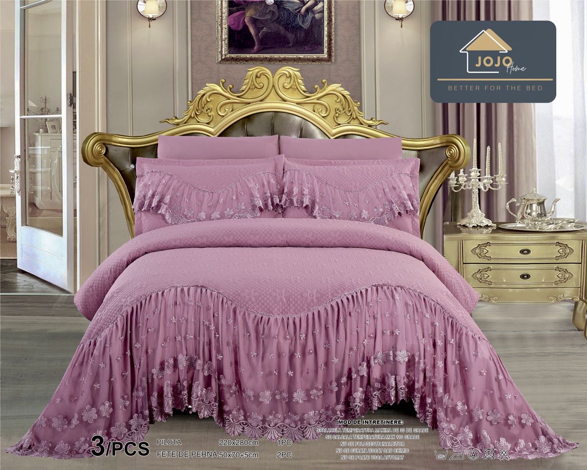 Cuvertura pentru pat dublu confectionata din Bumbac 100% cu volanase din 3 piese. Imprimeurile sunt realizate cu cele mai noi tehnologii, astfel nu se decoloreaza la spalare daca se respecta instructiunile de intretinere. Pachetul include: