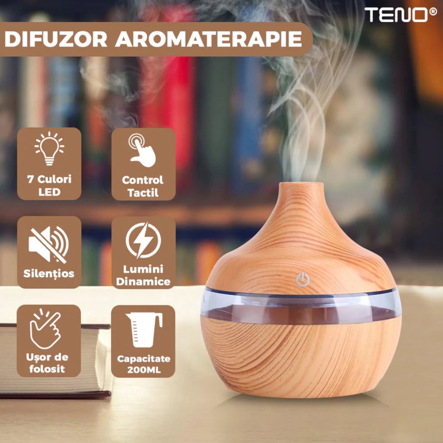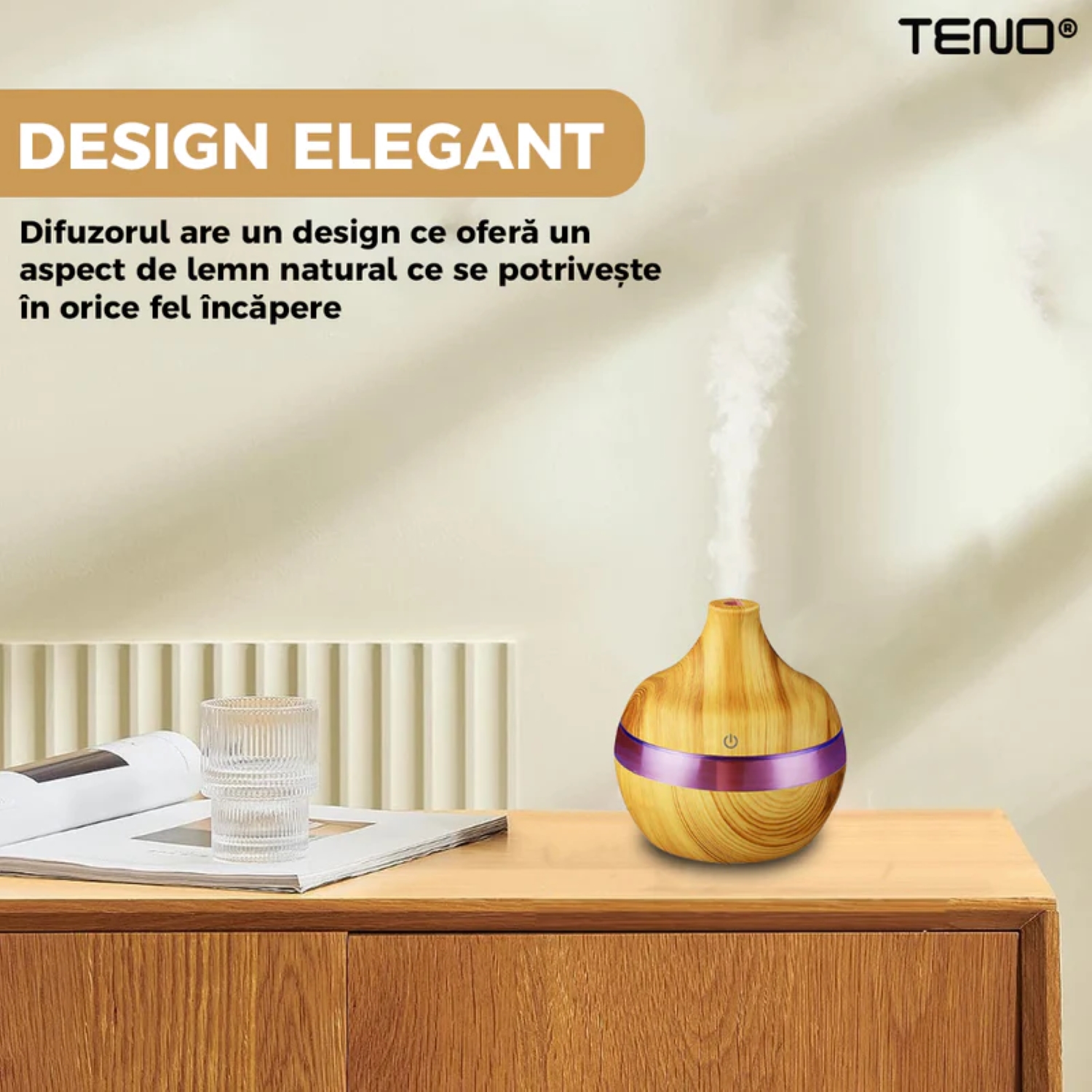 - Design Elegant: Cu finisajul său din stejar deschis, difuzorul se integrează perfect în orice decor, adăugând o notă de eleganță și rafinament.