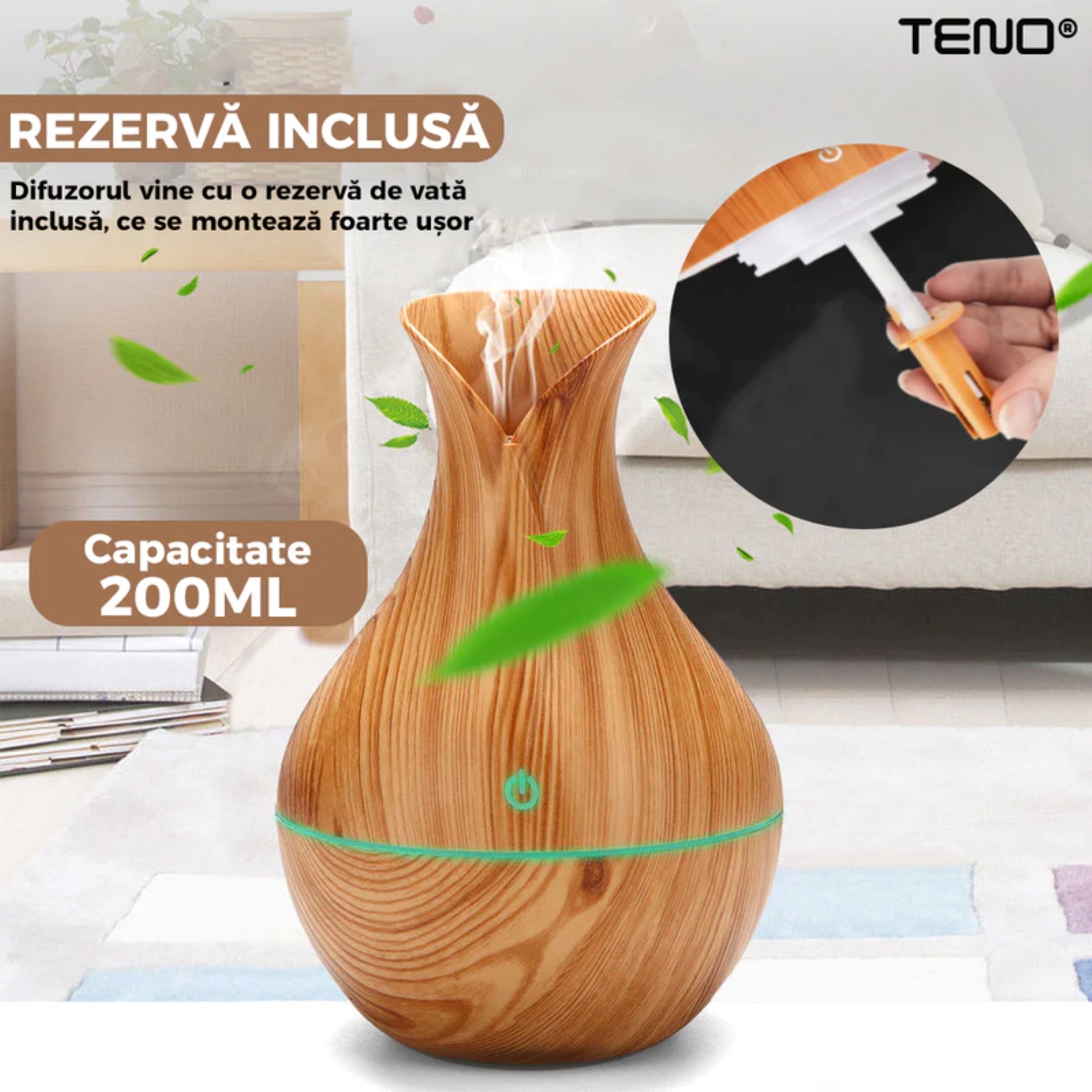 - Capacitate Optimă: Cu o capacitate de 200ml, difuzorul oferă o autonomie suficientă pentru a parfuma și umidifica o cameră de dimensiuni medii.