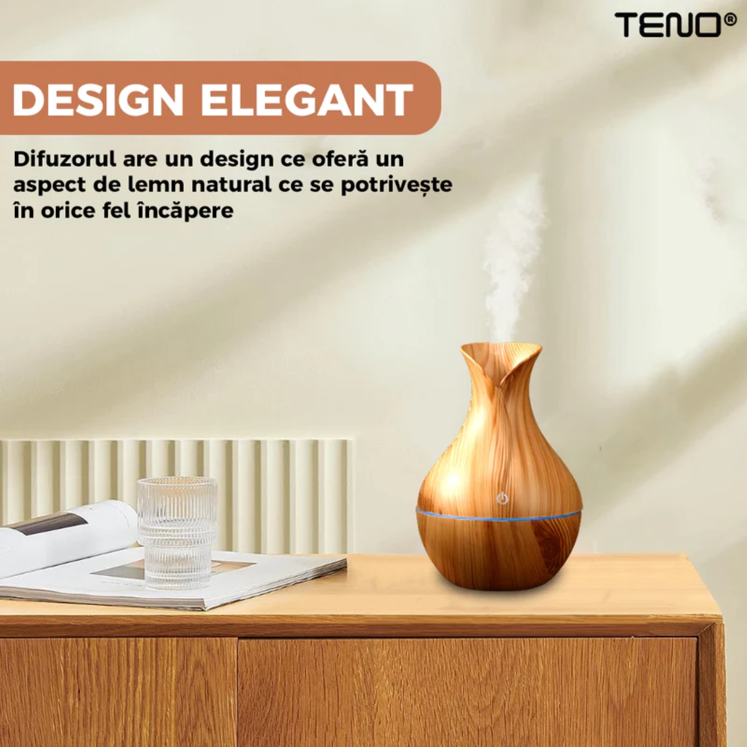 Difuzorul de aromaterapie cu control tactil, lumini ambientale și design elegant din stejar deschis este alegerea perfectă pentru cei care își doresc să creeze o atmosferă relaxantă și plină de viață în propria casă.