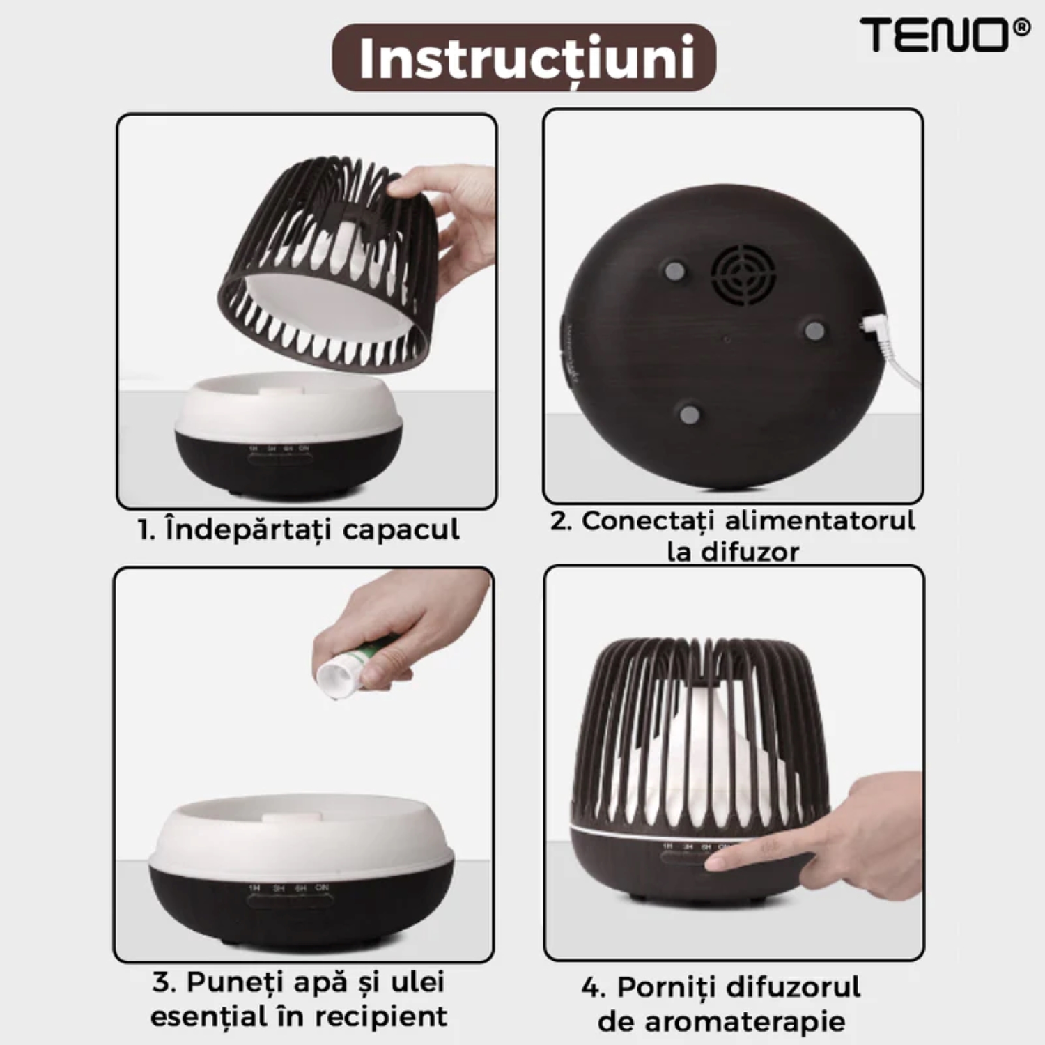 - Capacitate Generoasă: Cu o capacitate de 500ml, difuzorul oferă o autonomie suficientă pentru a parfuma și umidifica chiar și încăperi mai mari.