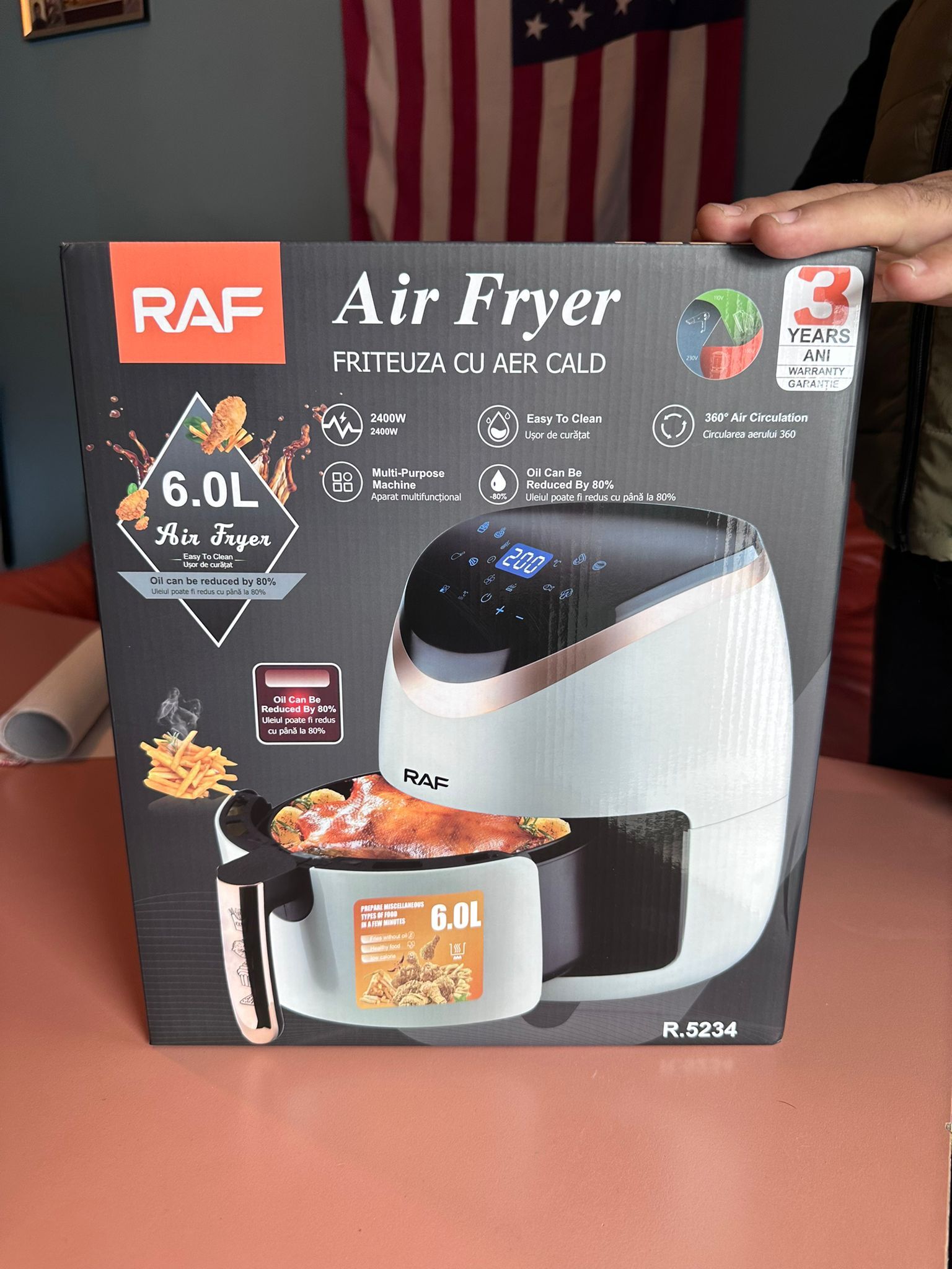 Friteuza Air Fryer RAF R.5234 este soluția perfectă pentru preparate sănătoase și gustoase, fără ulei! Cu o capacitate generoasă de 6 litri și o putere de 2400W, acest aparat inovator folosește circulația aerului cald la 360°, pentru a găti alimentele uniform și crocant, păstrând în același timp valorile nutriționale.