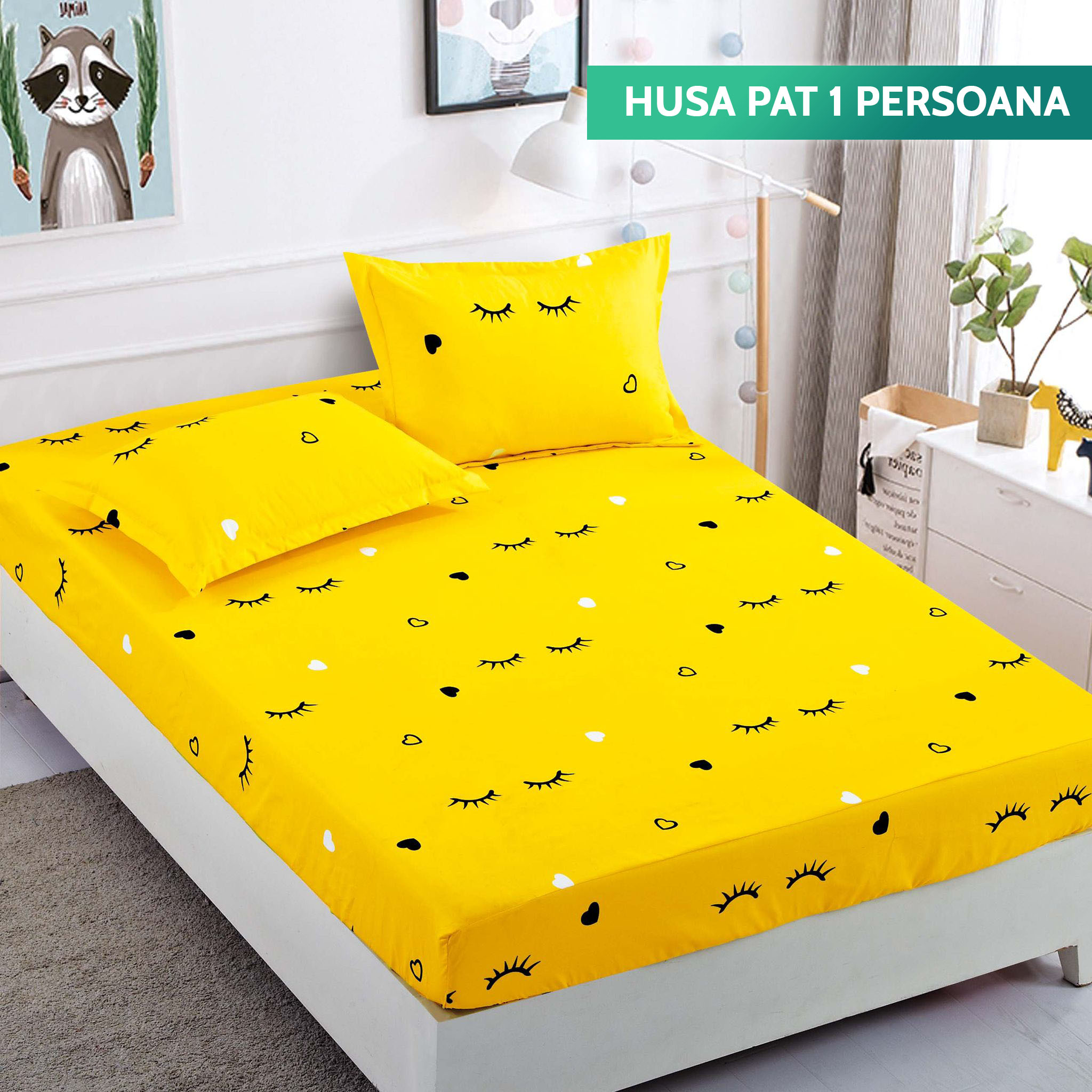 Husa Pat 1 Persoana cu Elastic, Bumbac Finet, 90 x 200 cm, Albinute, Galben/Negru, J23440