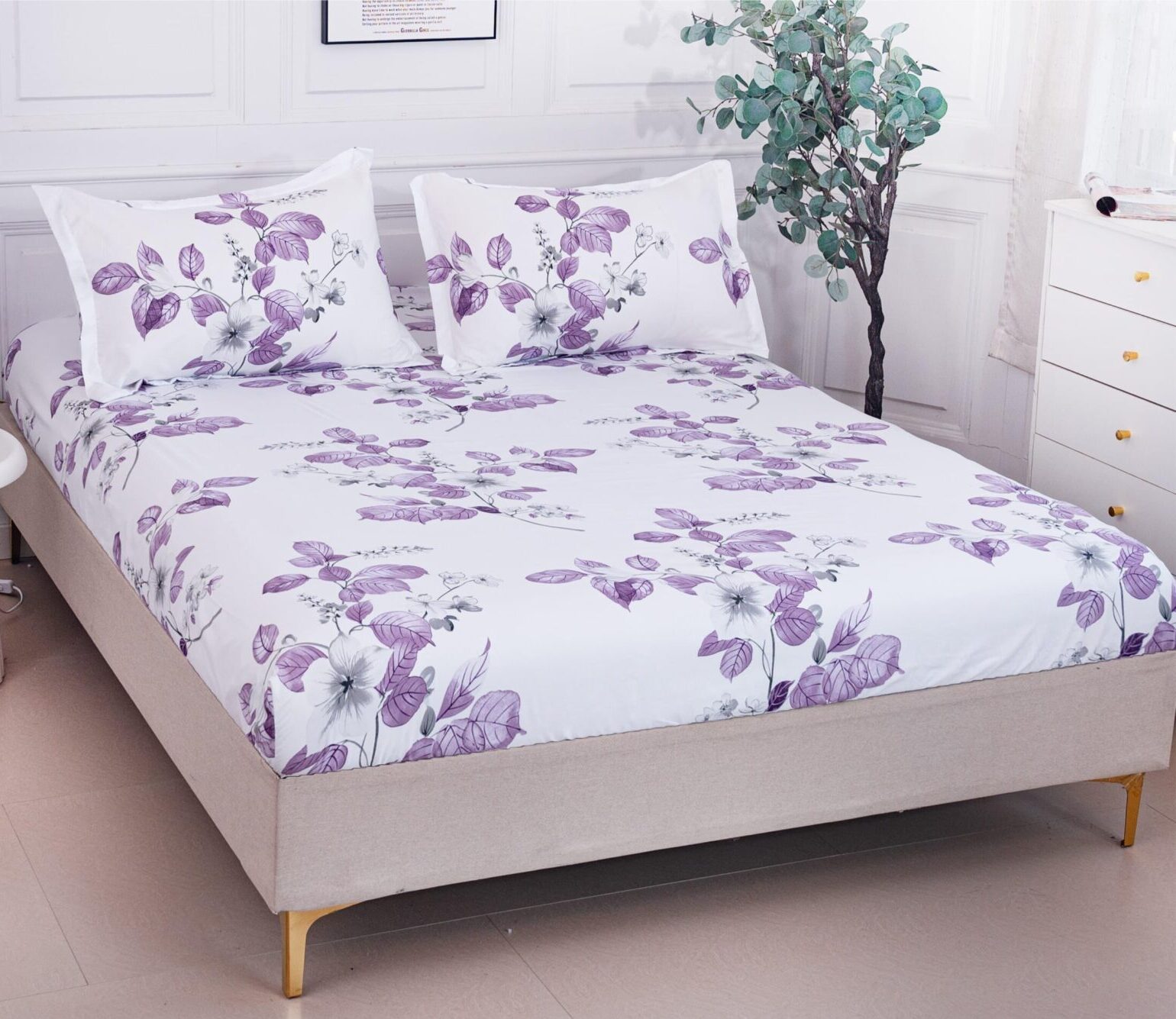 Husa Pat dublu cu elastic, Bumbac Satinat, 180×200, Floricele, Lila, P23773