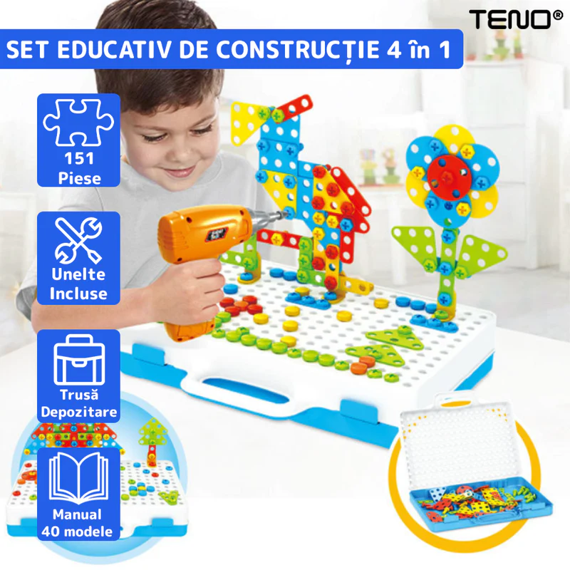 - Versatilitate uimitoare: Cu cele 151 de piese colorate și unelte specifice, copiii pot construi o varietate de modele 2D și 3D, de la mașini și case până la animale și roboți.