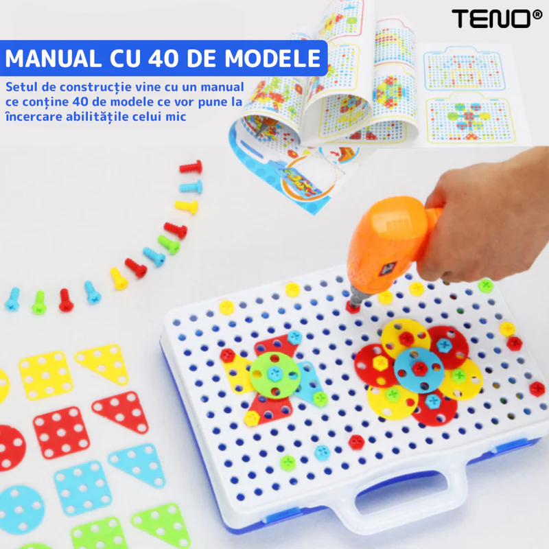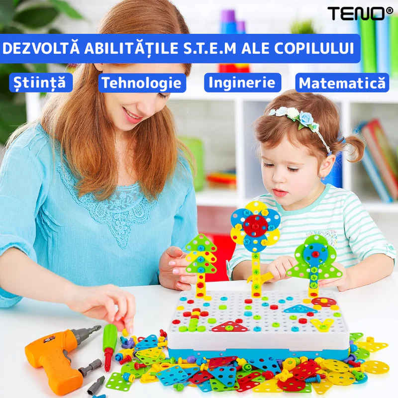 - Dezvoltarea abilităților motorii fine: Manipularea pieselor mici și utilizarea bormășinii îmbunătățesc coordonarea mână-ochi și dexteritatea.