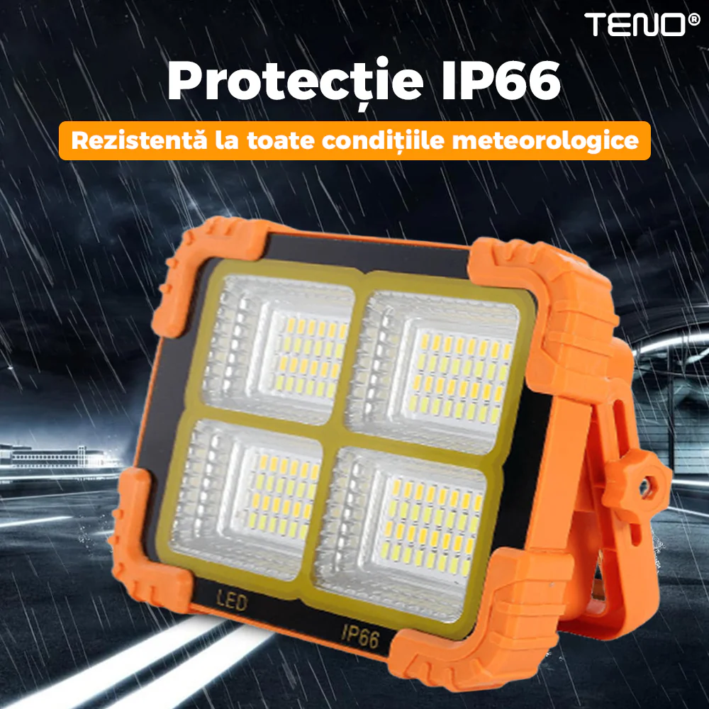 Lampă Solară Teno268 are o protecție IP66, ceea ce înseamnă că este complet protejată împotriva prafului și poate rezista expunerii prelungite la ploaie și alte condiții meteorologice dificile. Această certificare o face ideală pentru utilizarea în aer liber, indiferent de condițiile meteo, și asigură durabilitatea și performanța chiar și în medii umede sau prăfuite. Carcasa solidă și materialele de calitate contribuie la rezistența acesteia, prelungind durata de viață a produsului.