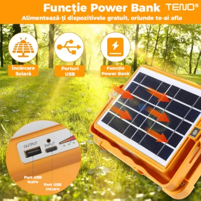 Una dintre caracteristicile unice ale acestei lămpi solare este funcția de power bank, care permite reîncărcarea dispozitivelor mobile în situații de urgență. Dotată cu un port USB, lampa Teno268 poate alimenta telefonul sau alte dispozitive mici, asigurând o soluție practică pentru cei care se află în zone fără acces la energie electrică. Aceasta este o funcție extrem de utilă în camping sau în călătorii prelungite în natură.
