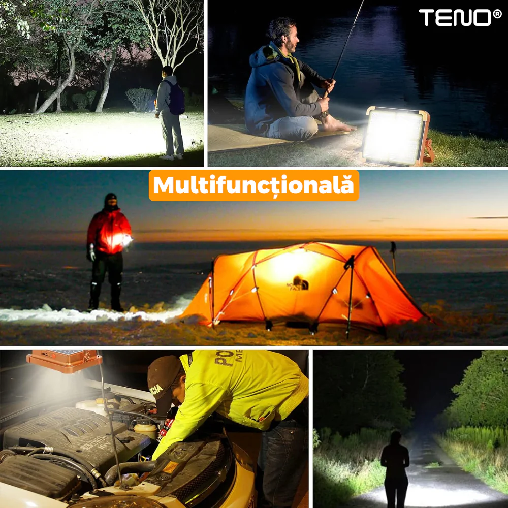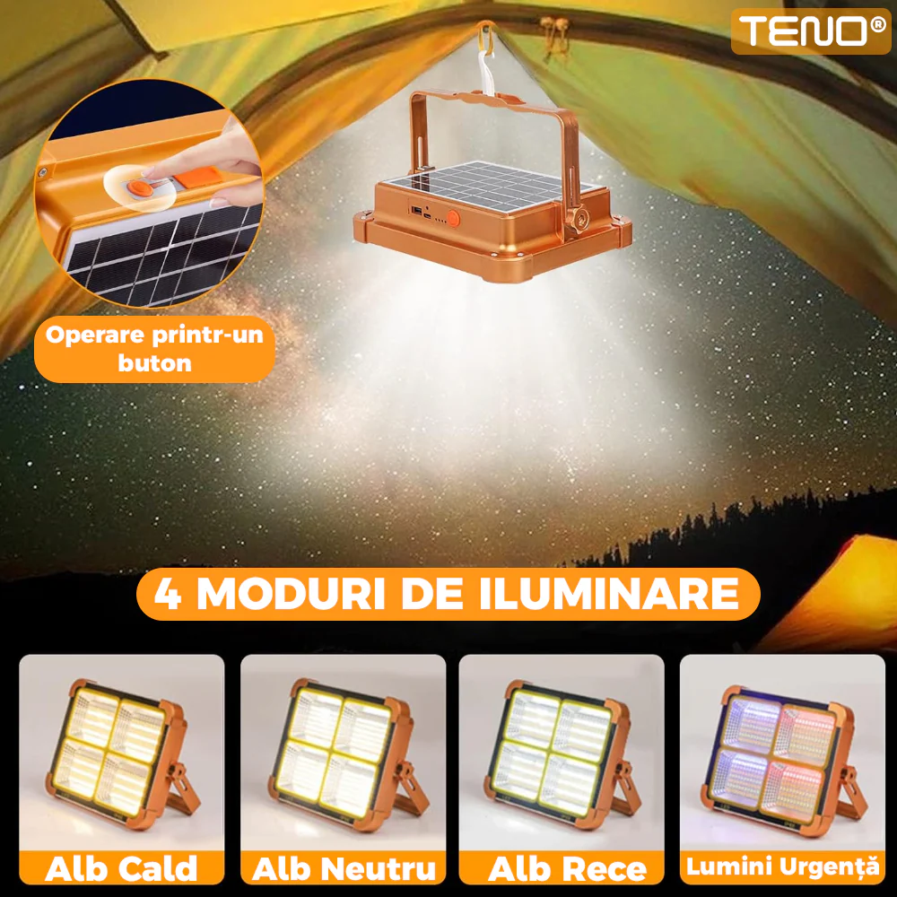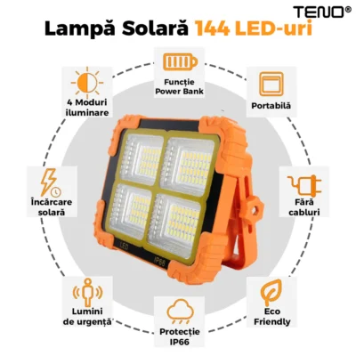 Lampă Solară Teno268 este o soluție modernă și versatilă de iluminare pentru exterior, concepută atât pentru utilizarea de zi cu zi, cât și pentru situații de urgență. Echipată cu 144 LED-uri, această lampă oferă o iluminare puternică și este alimentată cu energie solară, fiind astfel o opțiune ecologică și economică. Fiind portabilă și rezistentă la apă, este ideală pentru camping, curți, grădini, călătorii sau alte activități în aer liber, precum și ca sursă de lumină de urgență.