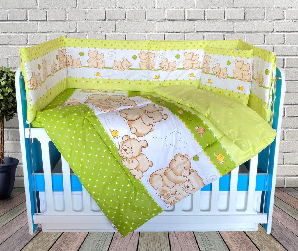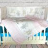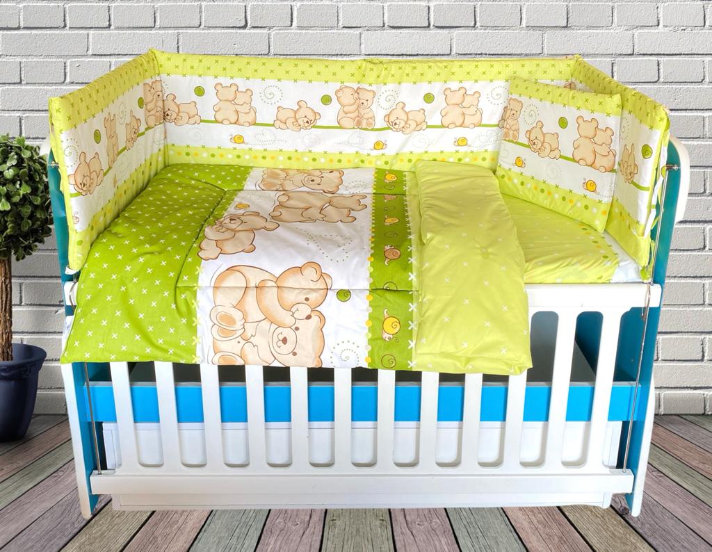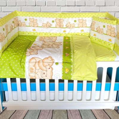 Aceasta lenjerie pentru patul bebelusului are un design atractiv care va oferi un aspect de uimitor camerei copilului dumneavoastra. Produsul este recomandat pentru paturile de bebelusi cu dimensiunea de 120 x 60 cm . Lenjeria este confectionata din bumbac 100% de calitate superioara si este prevazuta cu o umplutura din poliester de calitate, non-alergic, ideal pentru nou-nascuti. Cearsaful este prevazut cu elastic pentru o fixare cat mai buna, iar pernita este confortabila si subtire, conform recomandarii medicilor.