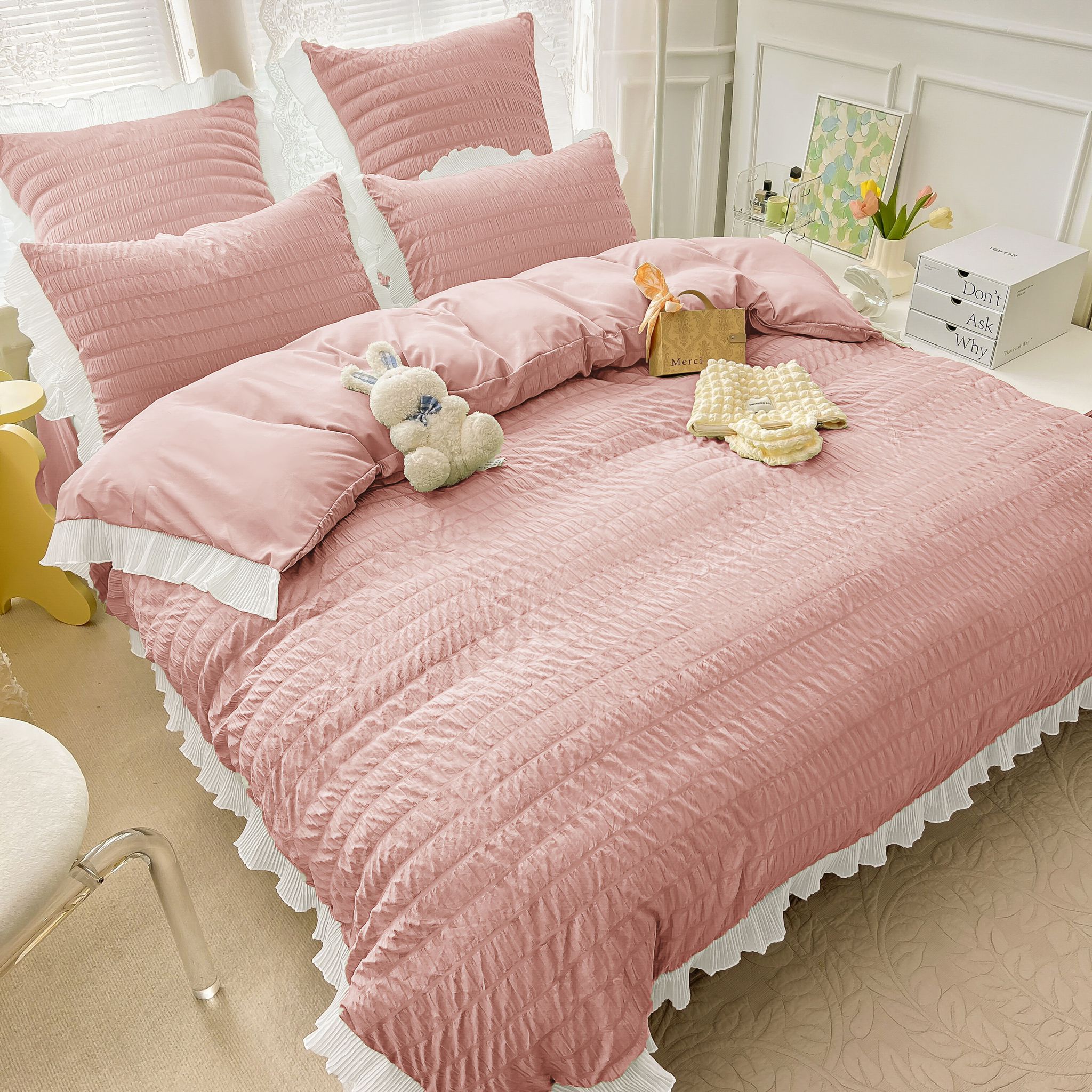Cuvertura cu Volanase, Pat Dublu, 3 Piese, UNI, Crem, J14654
