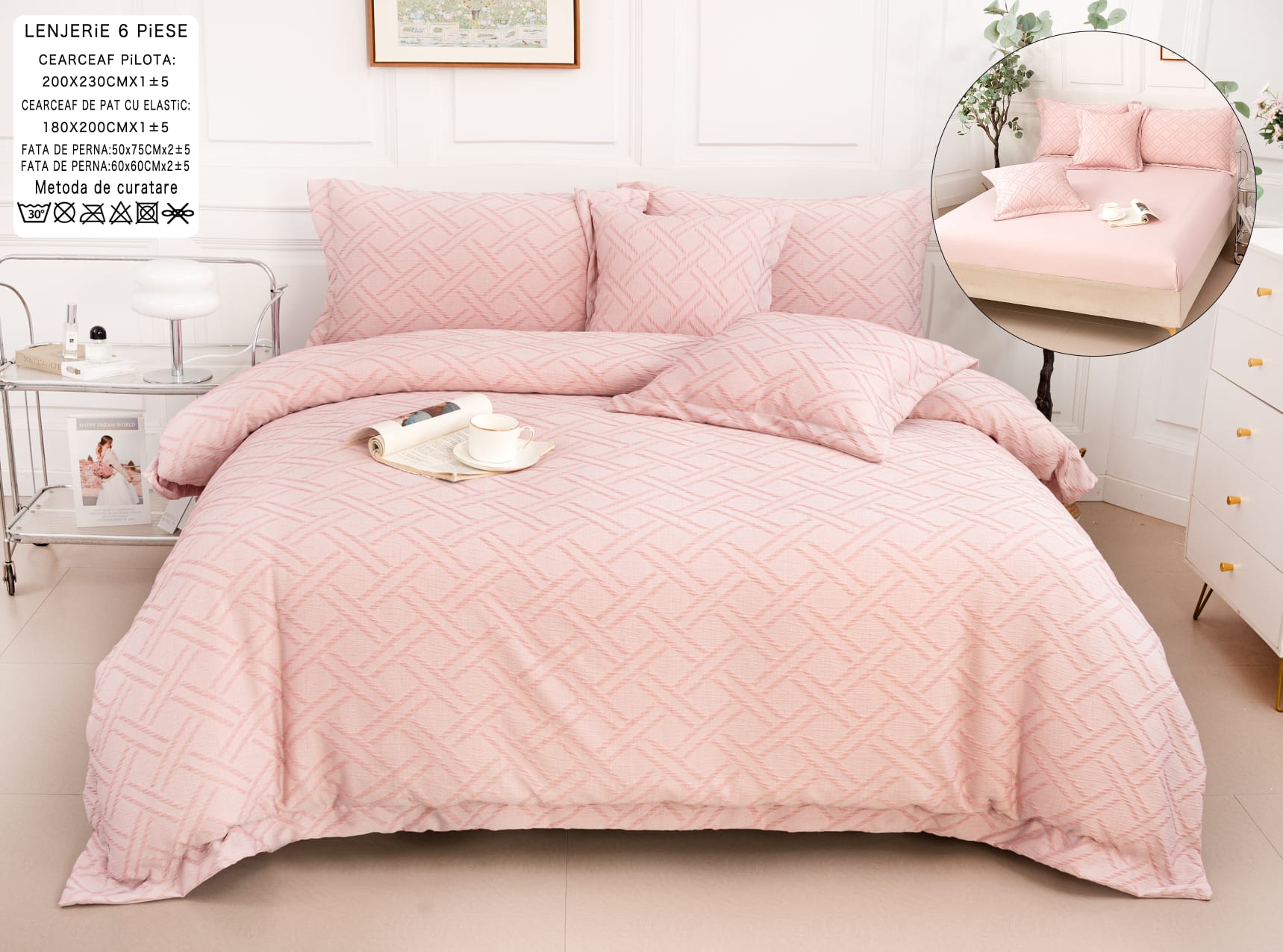 Lenjerie pat, Bumbac Fin, IN Grofat Latos, 6 Piese, Linii, Roz, P23665-Elastic