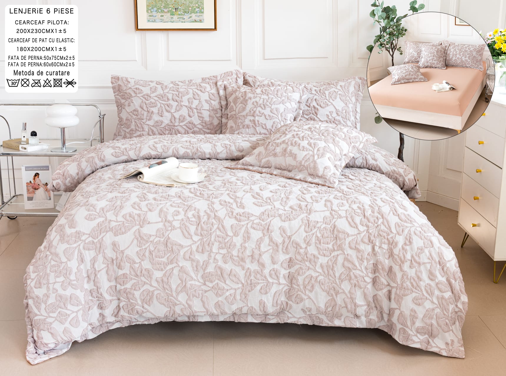 Lenjerie pat, Bumbac Fin, IN Grofat Latos, 6 Piese, Frunze, Crem, P23671-Elastic