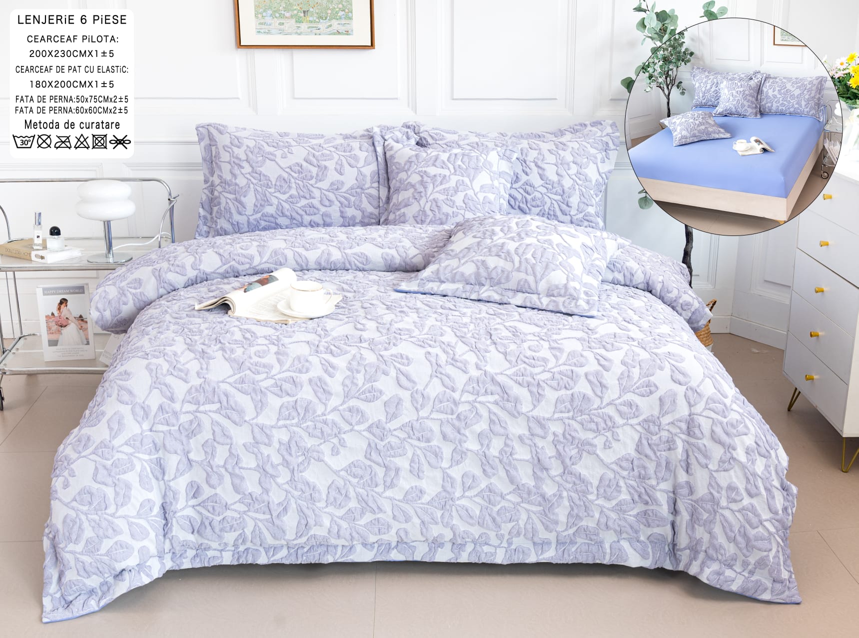 Lenjerie pat, Bumbac Fin, IN Grofat Latos, 6 Piese, Frunze, Lila, P23672-Elastic