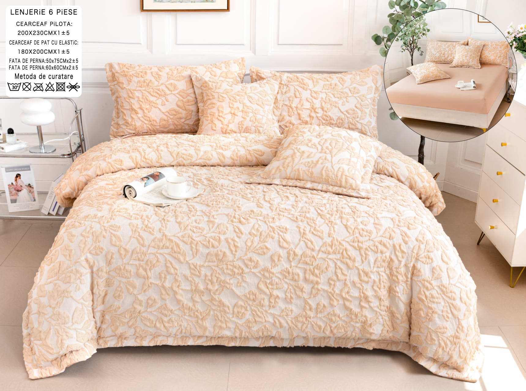 - Lenjeria de pat cu 6 piese din bumbac fin cu in grofat lățos este alegerea perfectă pentru un somn confortabil și relaxant. Realizată dintr-un amestec de bumbac fin și in, această lenjerie oferă o senzație plăcută la atingere, fiind moale, dar în același timp rezistentă și durabilă.