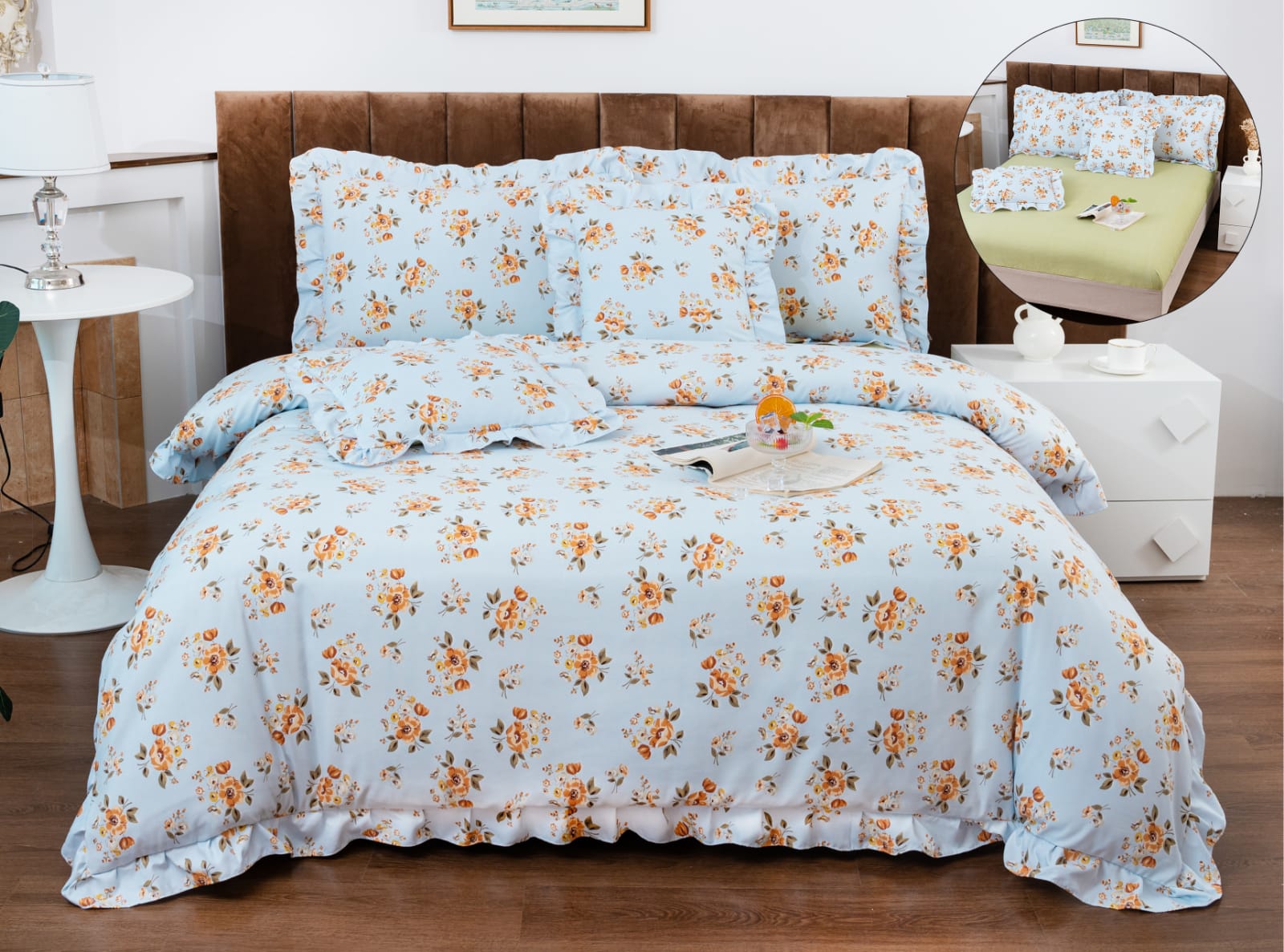 Lenjerie pat, Bumbac Finet, Volanase, 6 Piese, Floricele, Albastru, P23649-Elastic