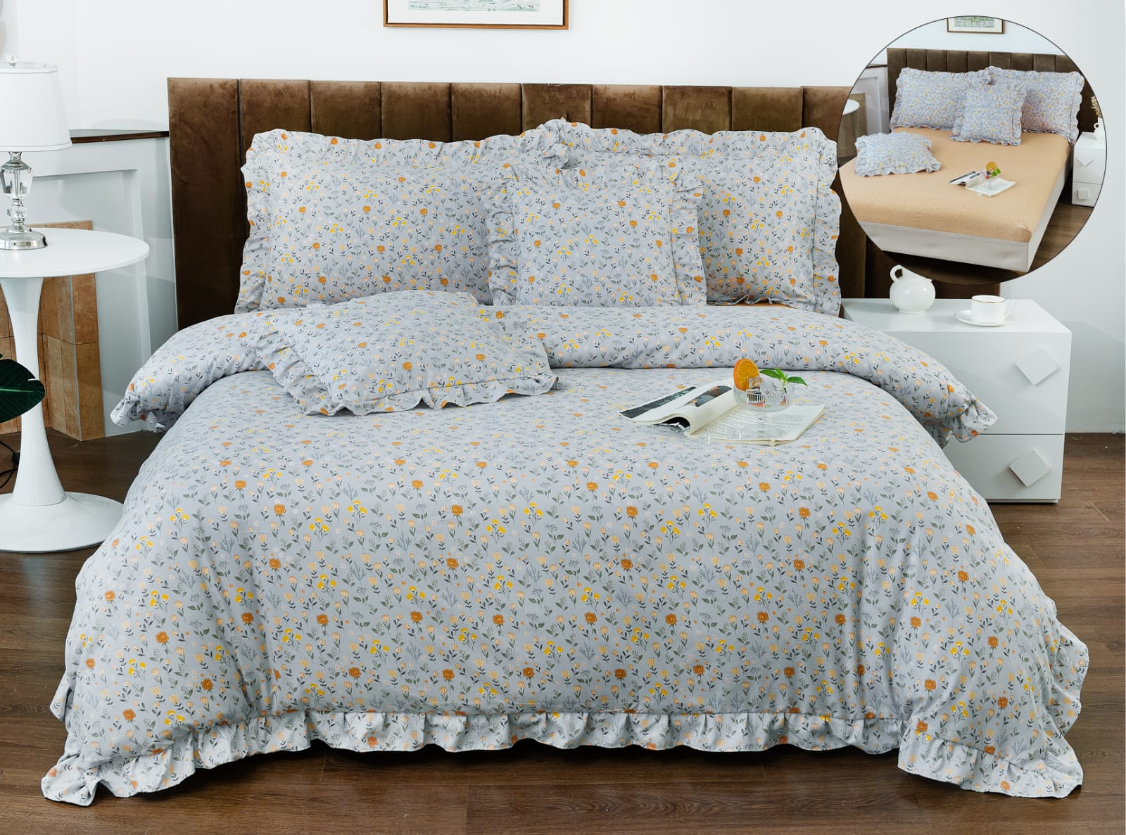 Lenjerie pat, Bumbac Finet, Volanase, 6 Piese, Floricele, Bleu/Galben, P23652-Elastic