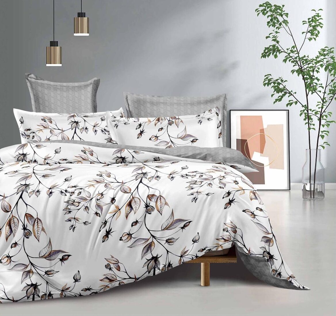 Lenjerie Pat Dublu, 4 Piese, Bumbac Finet, Frunze, Alb/Gri, C24363-Elastic