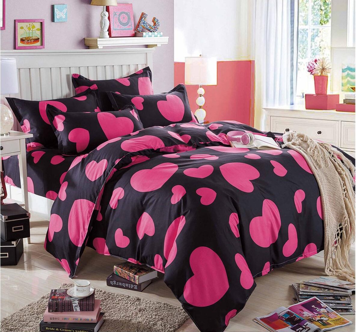 Lenjerie Pat Dublu, 4 Piese, Bumbac Finet, Inimioare, Negru/Roz, C24366-Elastic