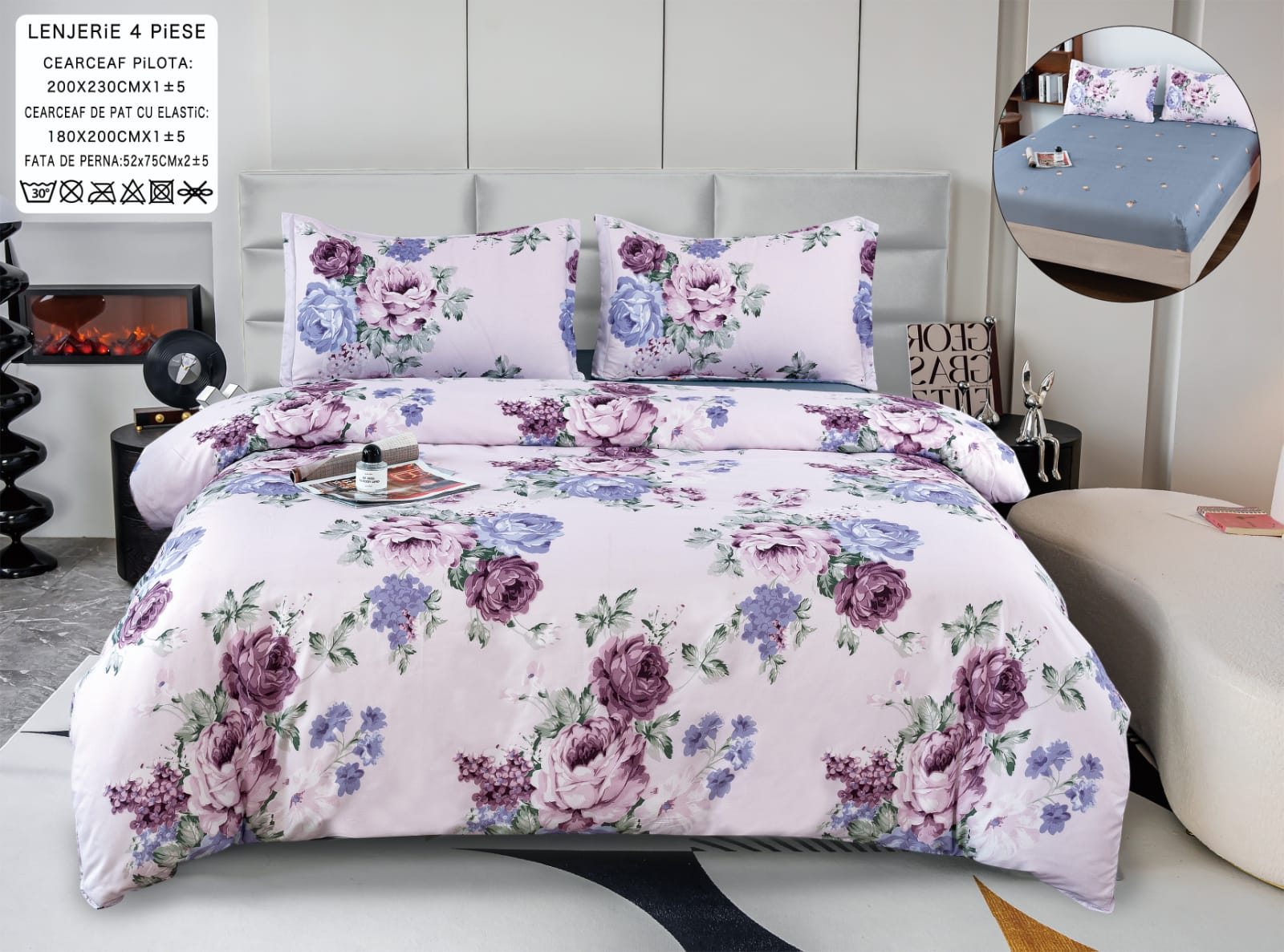 Dimensiunile acestei lenjerii sunt recomandate pentru pat dublu, de 2 persoane. Daca nu sunteti sigura ca se potriveste cu patul, va recomandam sa cititi urmatorul articol: Ce dimensiune sa aleg la lenjeria de pat?