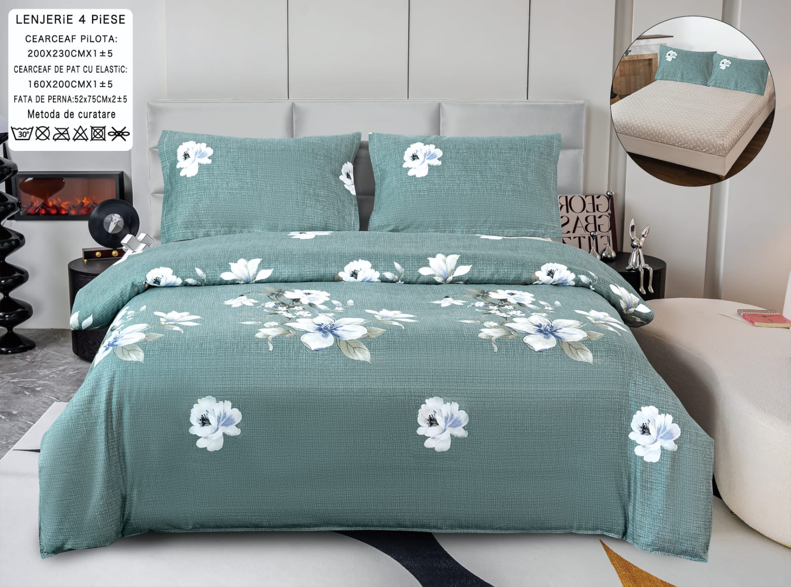 Lenjerie Pat Dublu, 4 Piese, Bumbac Satinat, Flori, Verde/Alb, PT24336-ELASTIC
