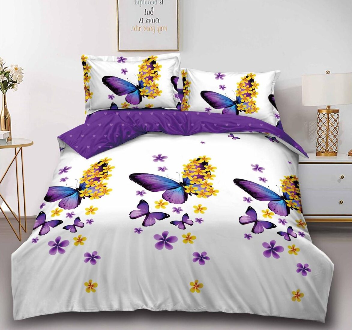 Lenjerie Pat Dublu, 4 Piese, Bumbac Satinat, Fluturi, Alb/Mov, C24364-Elastic