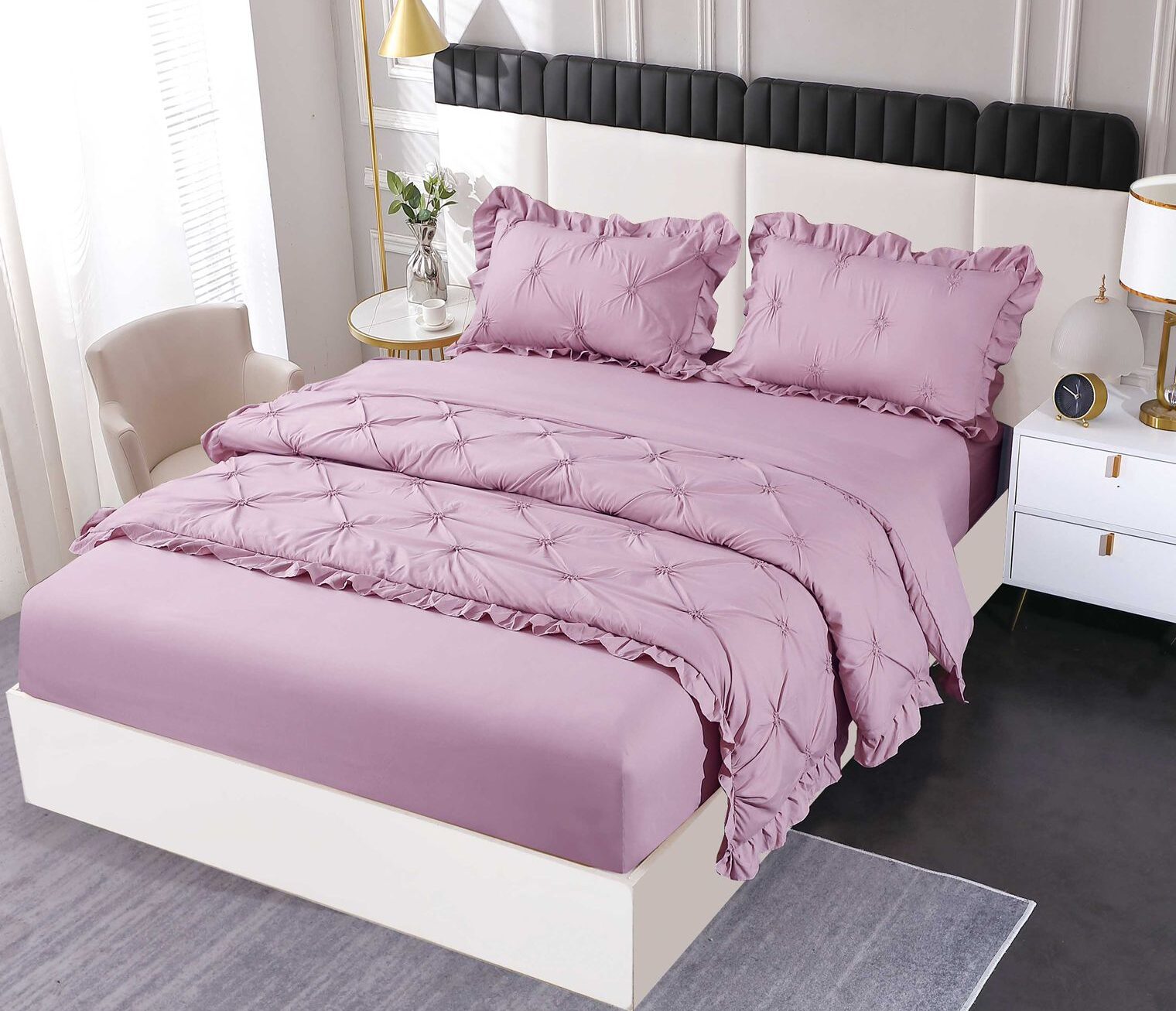 Lenjerie Pat Pliuri Si Volans, Bumbac Finet , UNI, 4 Piese, Lila, HR24250-Elastic