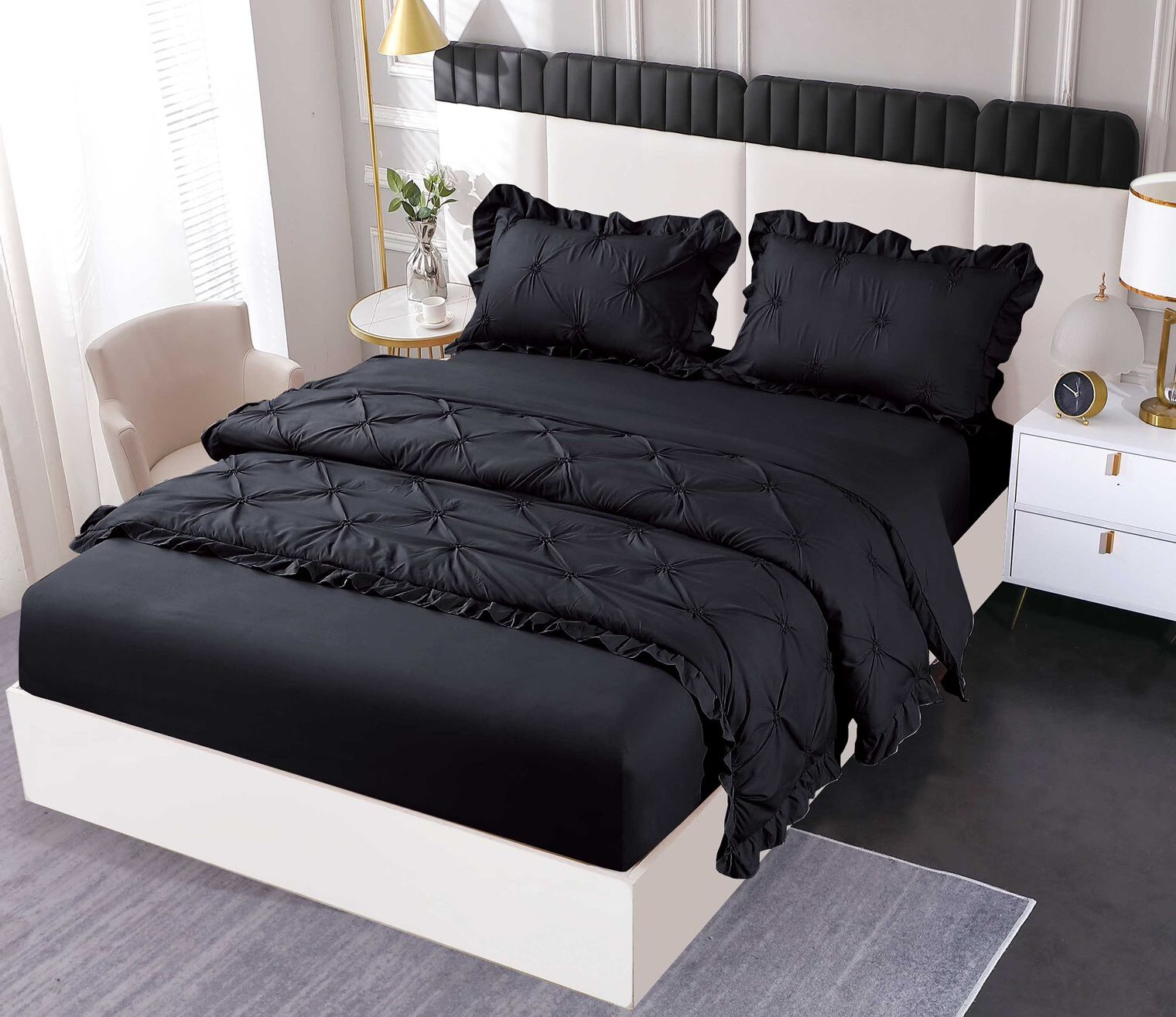 Lenjerie Pat Pliuri Si Volans, Bumbac Finet , UNI, 4 Piese, Negru, HR24256-Elastic