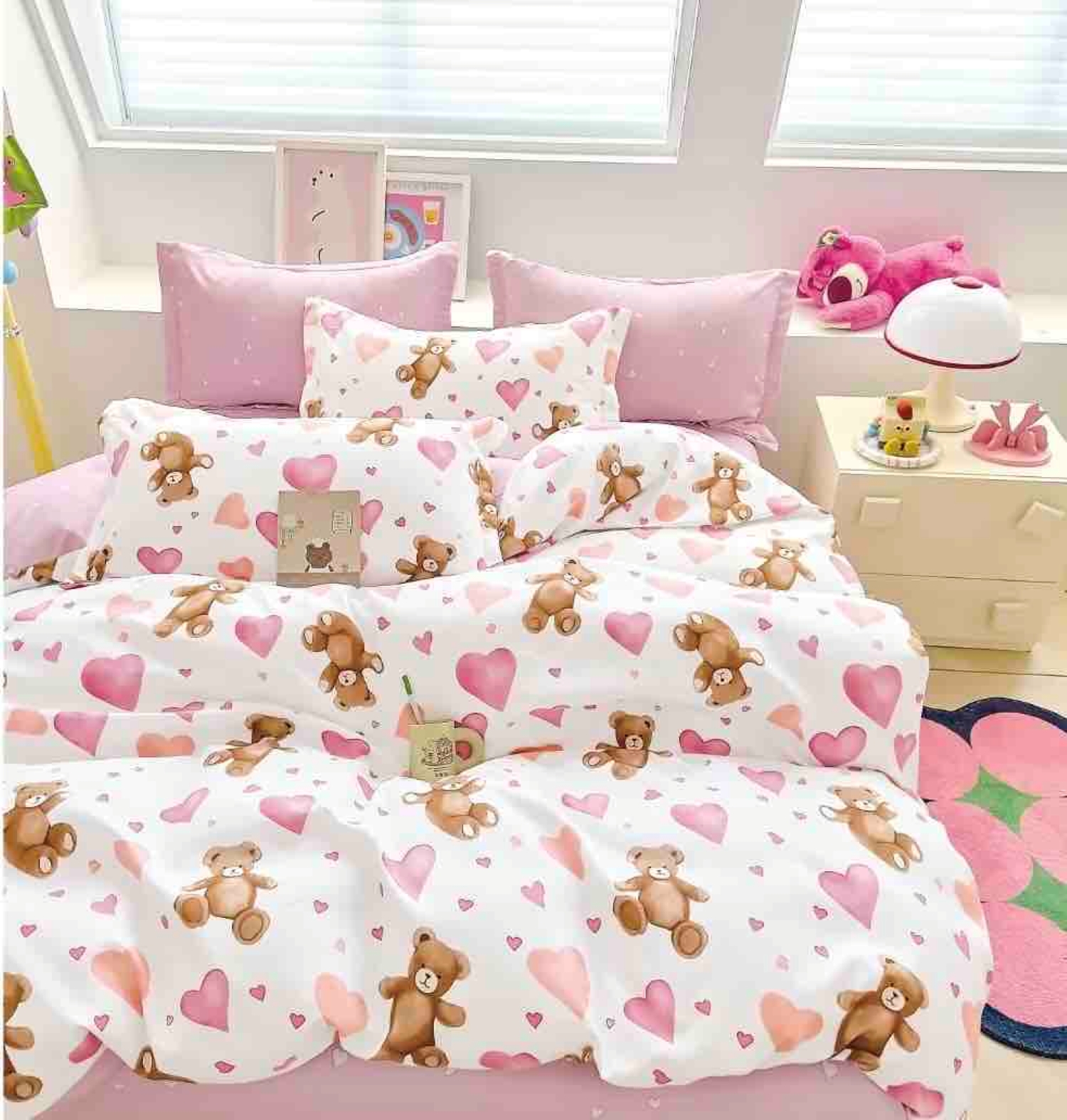 Lenjerie pat single 1 Persoana, 4 PIESE, Bumbac Finet, Ursuleti, Alb/Roz, J23722