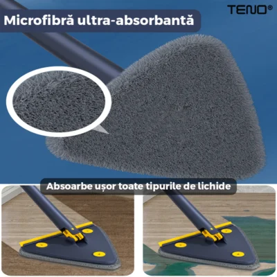 Mopul cu cap triunghiular Teno708 este un dispozitiv de curățenie conceput pentru a asigura o curățare eficientă și accesibilitate maximă în colțuri și spații greu de atins. Datorită capului triunghiular și a funcției de rotire la 360 de grade, acest mop este ideal pentru curățarea rapidă și eficientă a diferitelor tipuri de pardoseli. Vine echipat cu un mâner telescopic ajustabil și include trei lavete lavabile, asigurând o întreținere practică și economică.