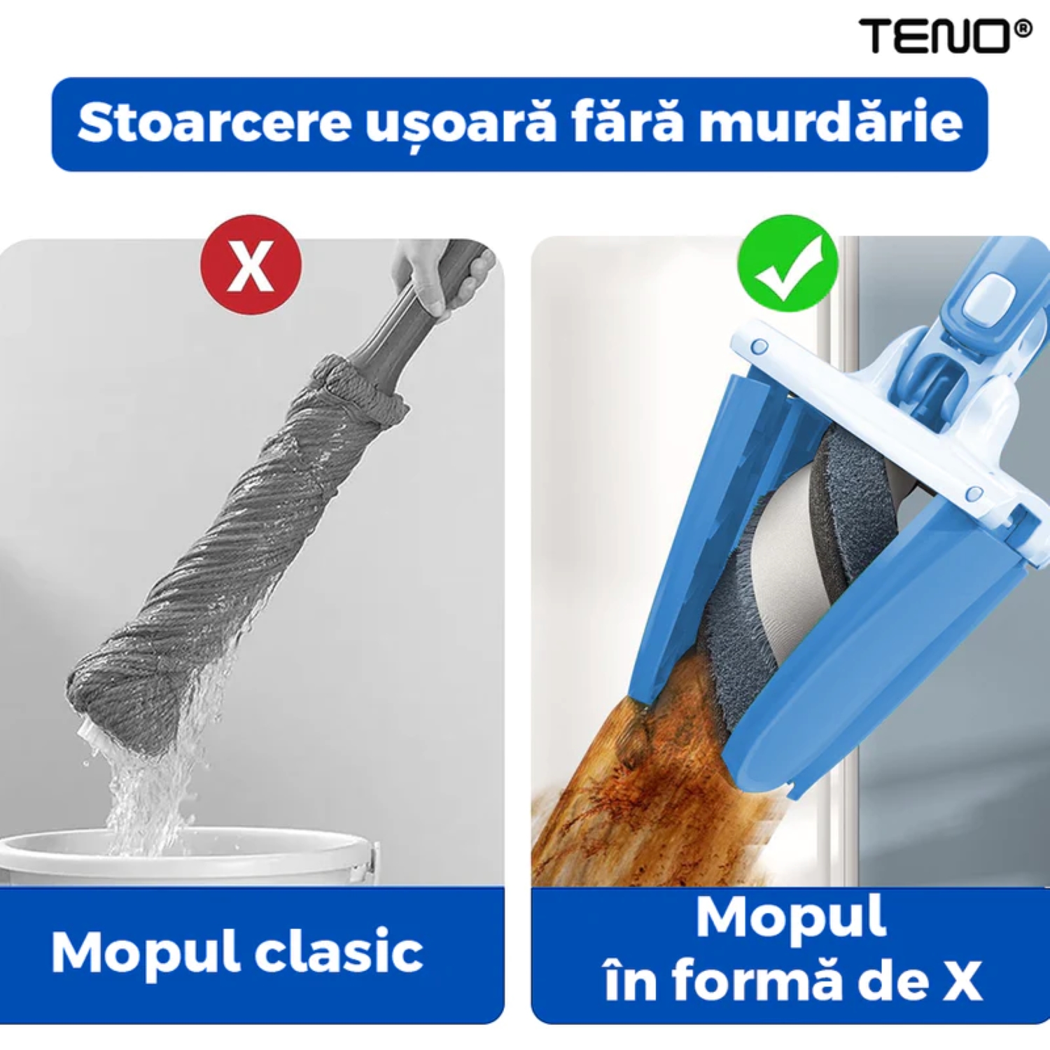 - Cap în formă de X: Designul în formă de X al capului mopului permite o curățare mai eficientă în colțuri și de-a lungul marginilor, ajungând în zonele greu accesibile cu ușurință.
