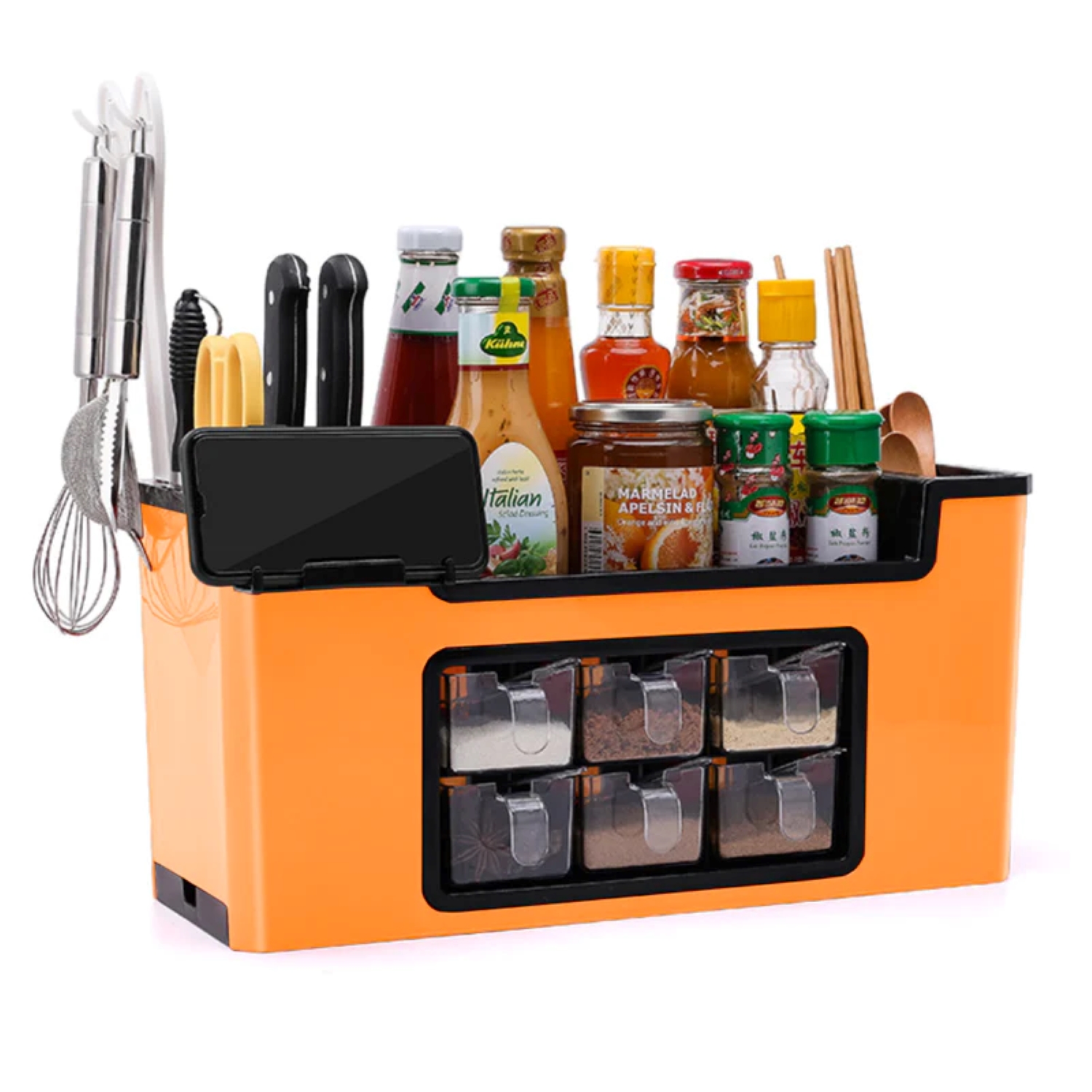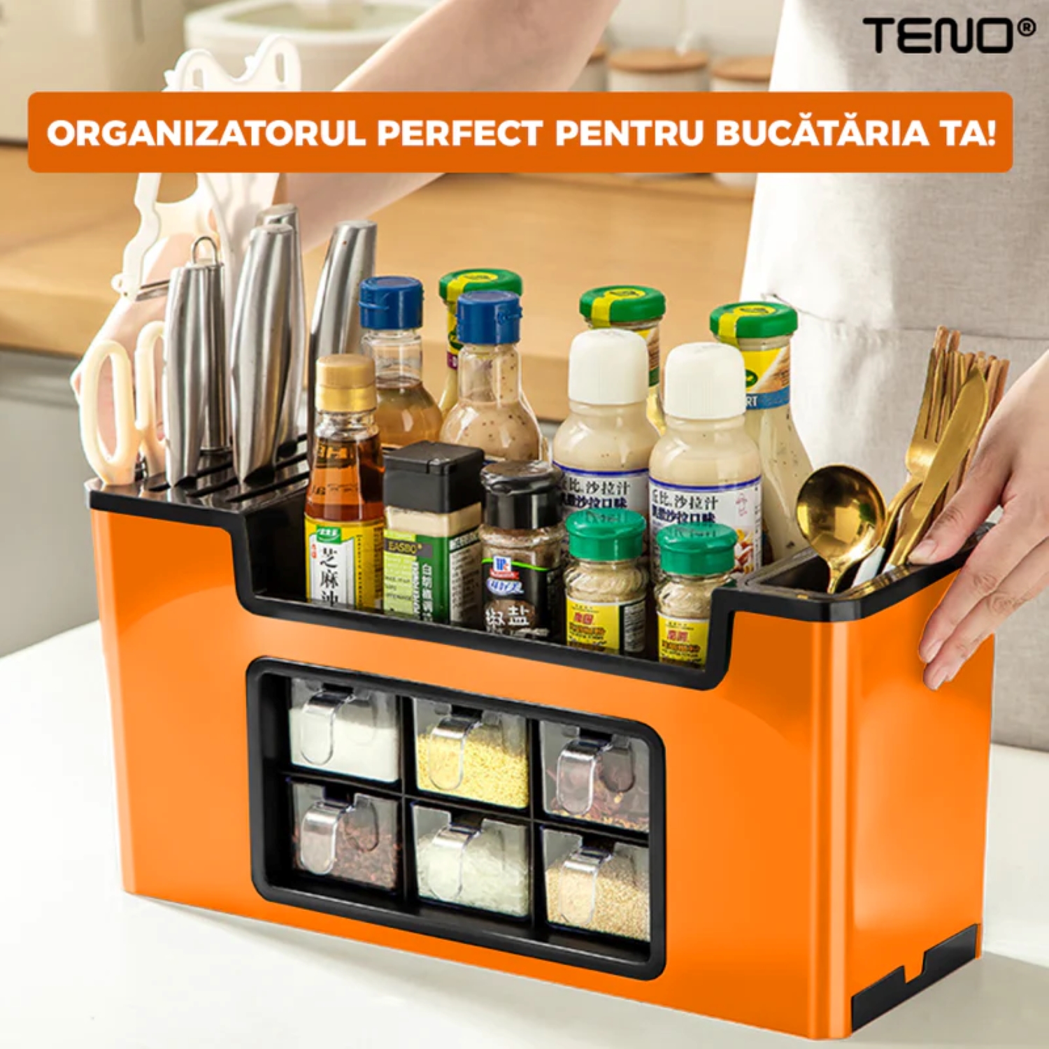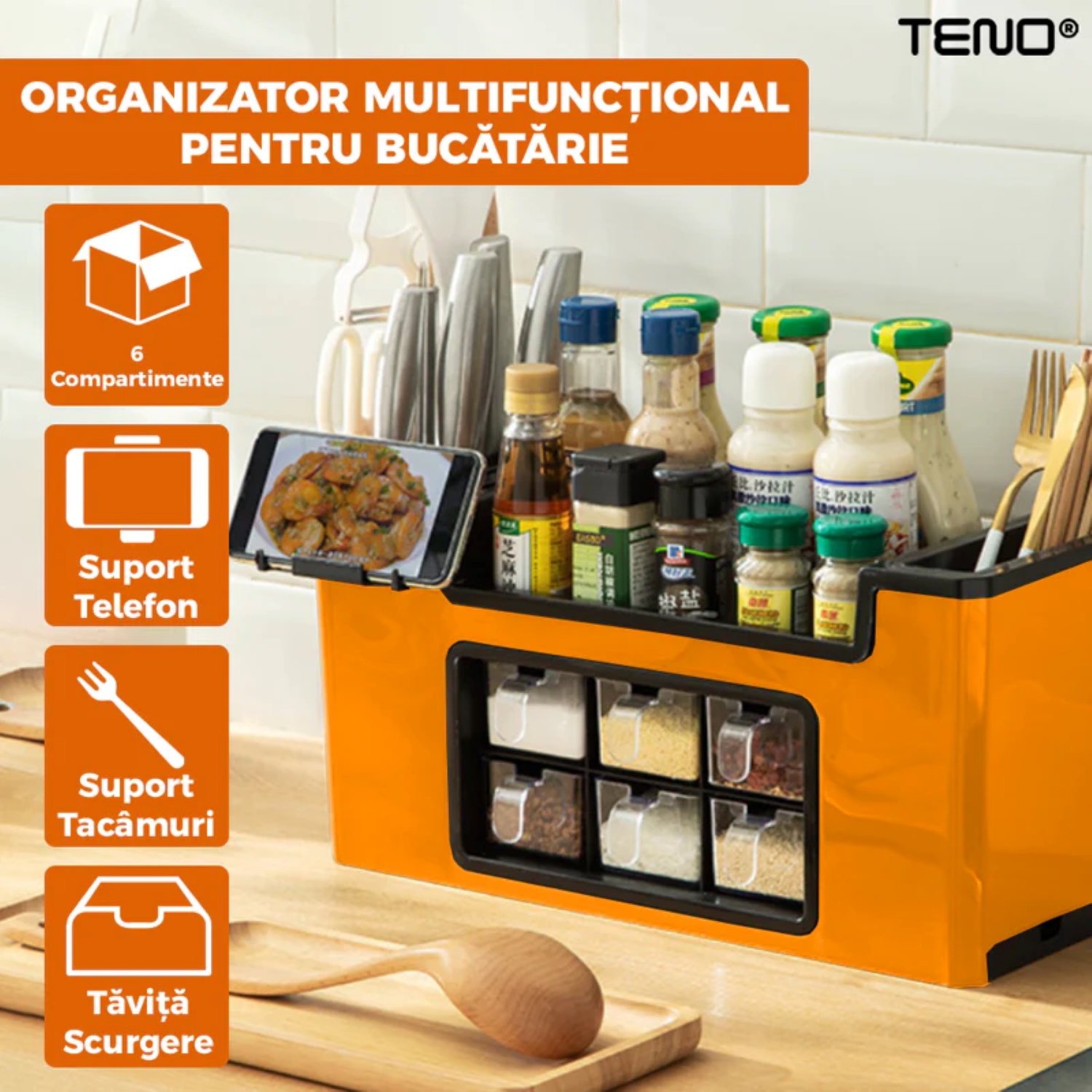 Un organizator multifuncțional pentru bucătărie este soluția perfectă pentru a-ți transforma spațiul de gătit într-un loc ordonat și funcțional. Cu cele 6 compartimente generoase, acest organizator îți oferă tot ce ai nevoie pentru a-ți păstra condimentele, tacâmurile și ustensilele la îndemână, fără a ocupa prea mult spațiu pe blat.