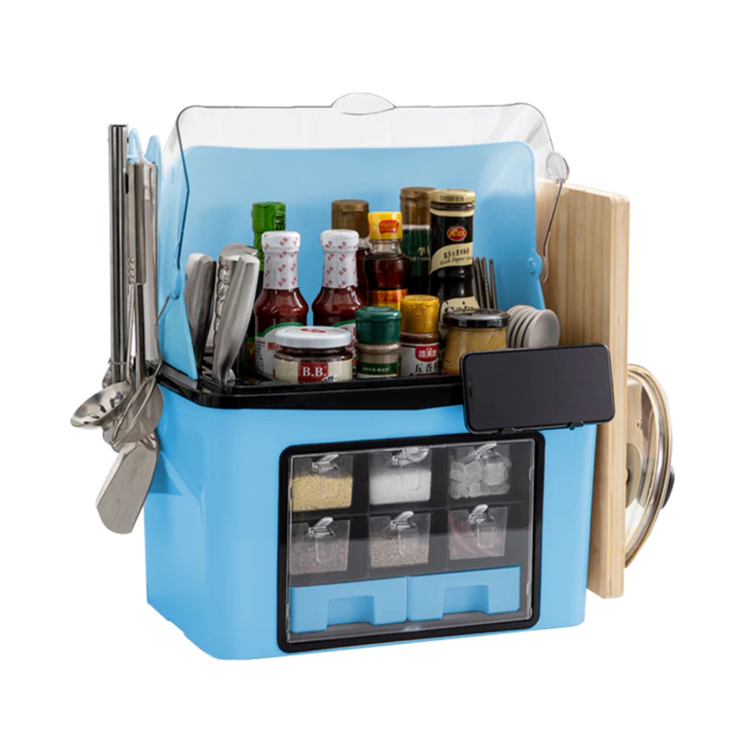- Compartimentare inteligentă: Organizatorul dispune de compartimente de diferite dimensiuni, perfecte pentru a depozita sticle cu ulei și oțet, condimente, ustensile de gătit, cuțite și chiar un tăieței. Fiecare obiect își va avea locul său special, facilitând găsirea rapidă a a ceea ce ai nevoie.