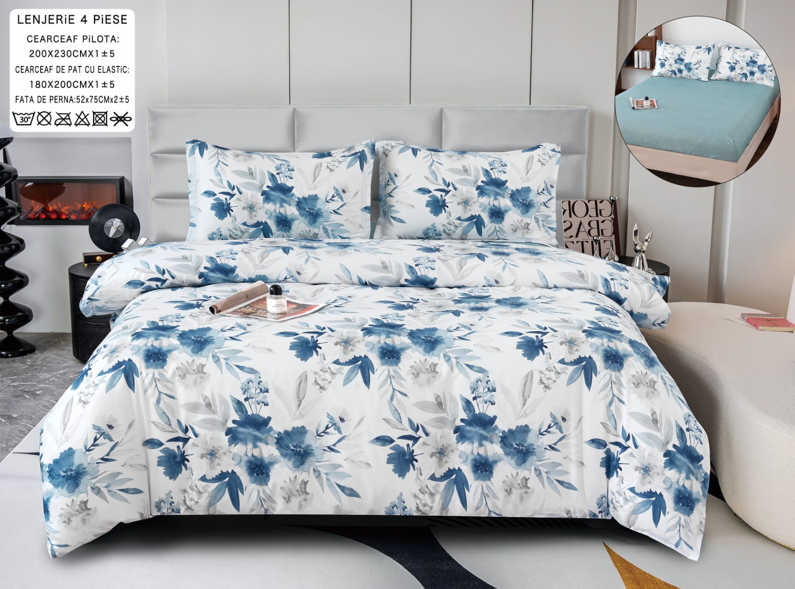 - Lenjerie de pat din bumbac satinat cu 4 piese pentru pat de 2 persoane