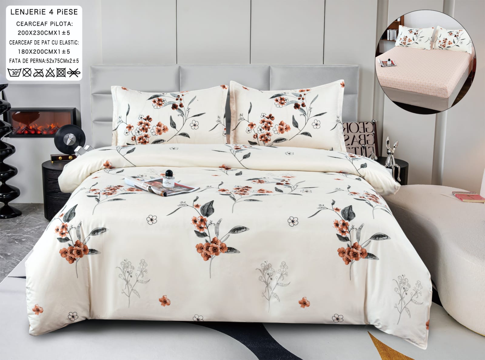 - Lenjerie de pat din bumbac satinat cu 4 piese pentru pat de 2 persoane