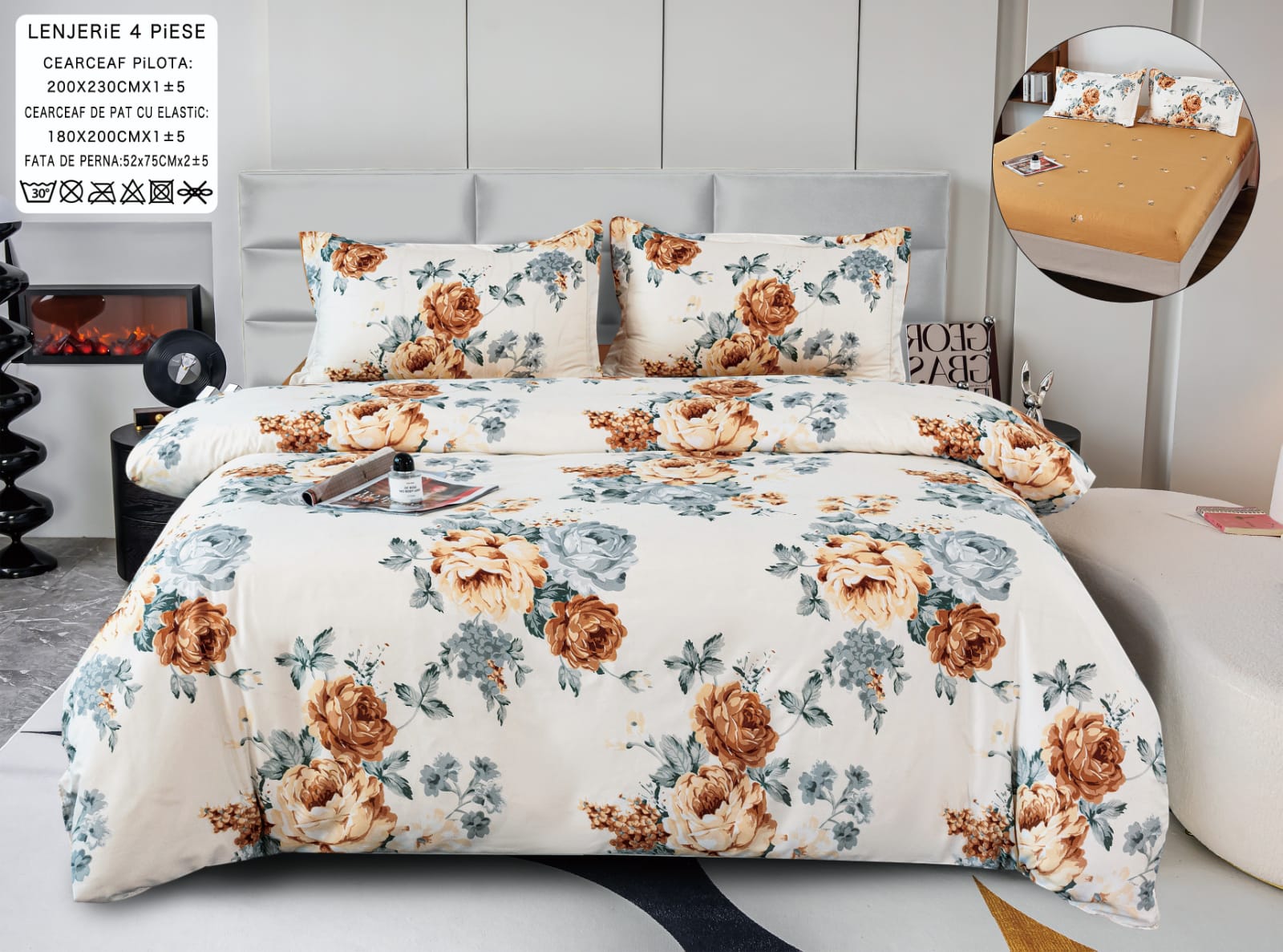 - Lenjerie de pat din bumbac satinat cu 4 piese pentru pat de 2 persoane