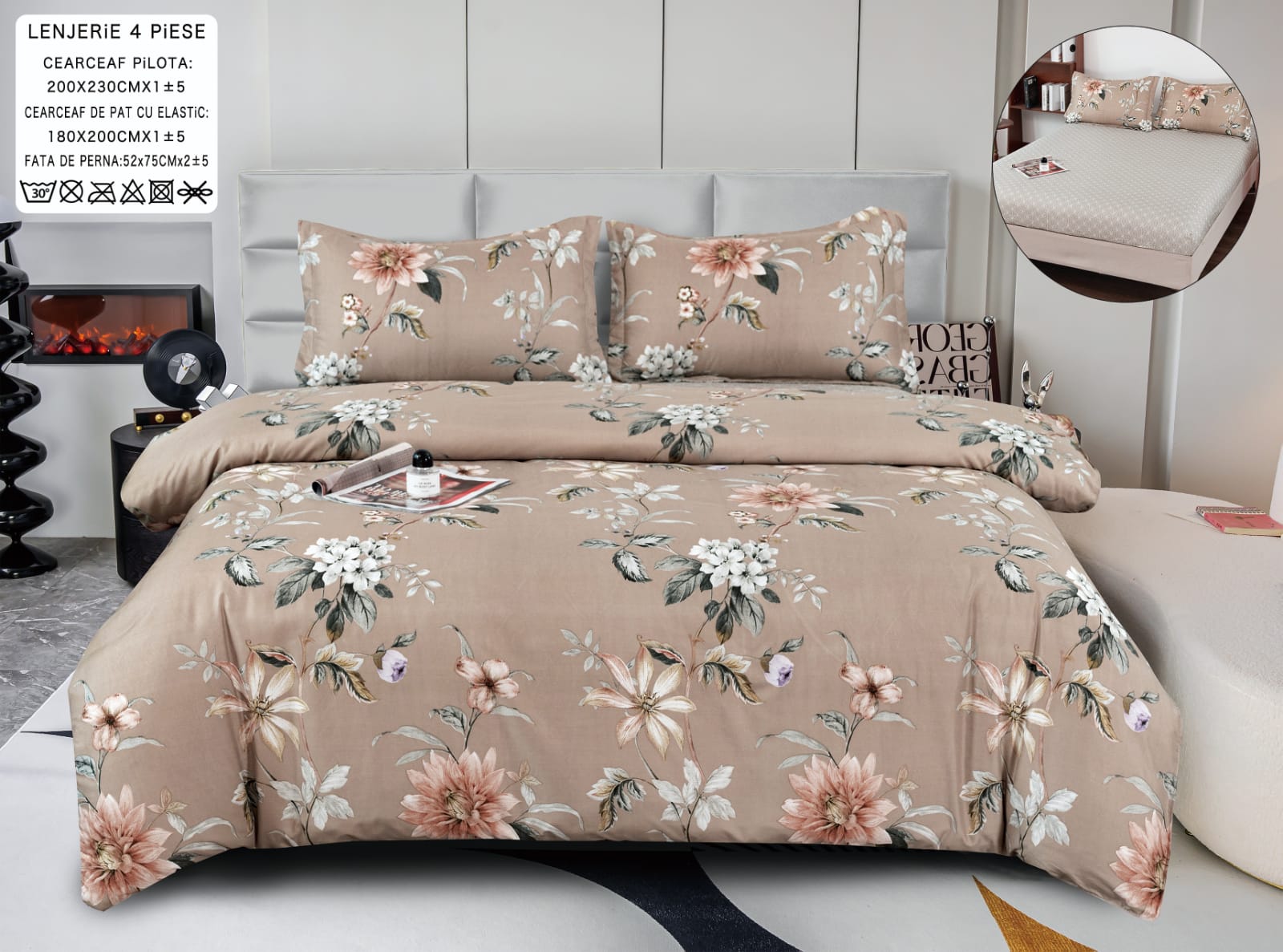 - Lenjerie de pat din bumbac satinat cu 4 piese pentru pat de 2 persoane