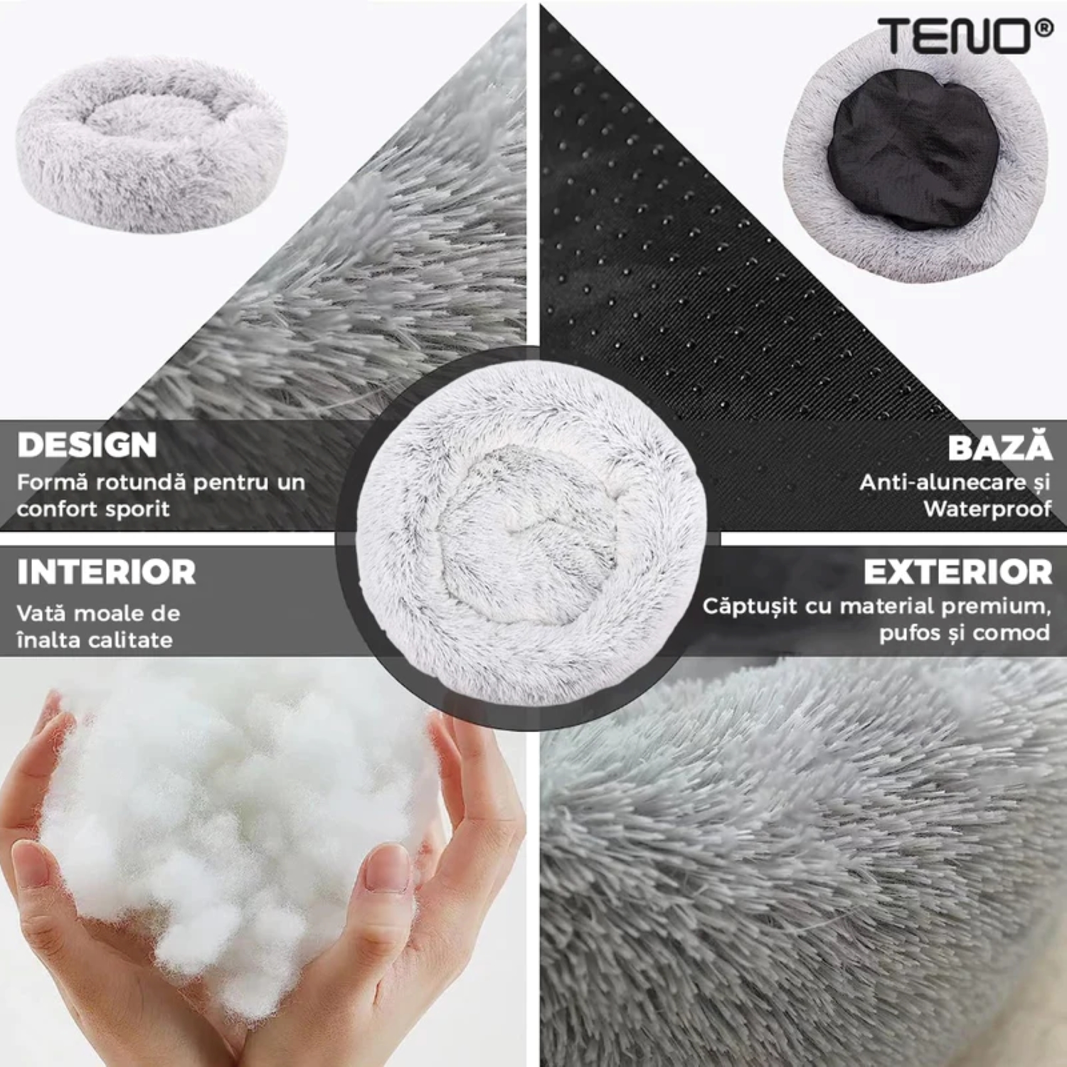 - Baza anti-alunecare: Datorită bazei anti-alunecare, patul rămâne fix în același loc, indiferent cât de mult se mișcă animalul tău.