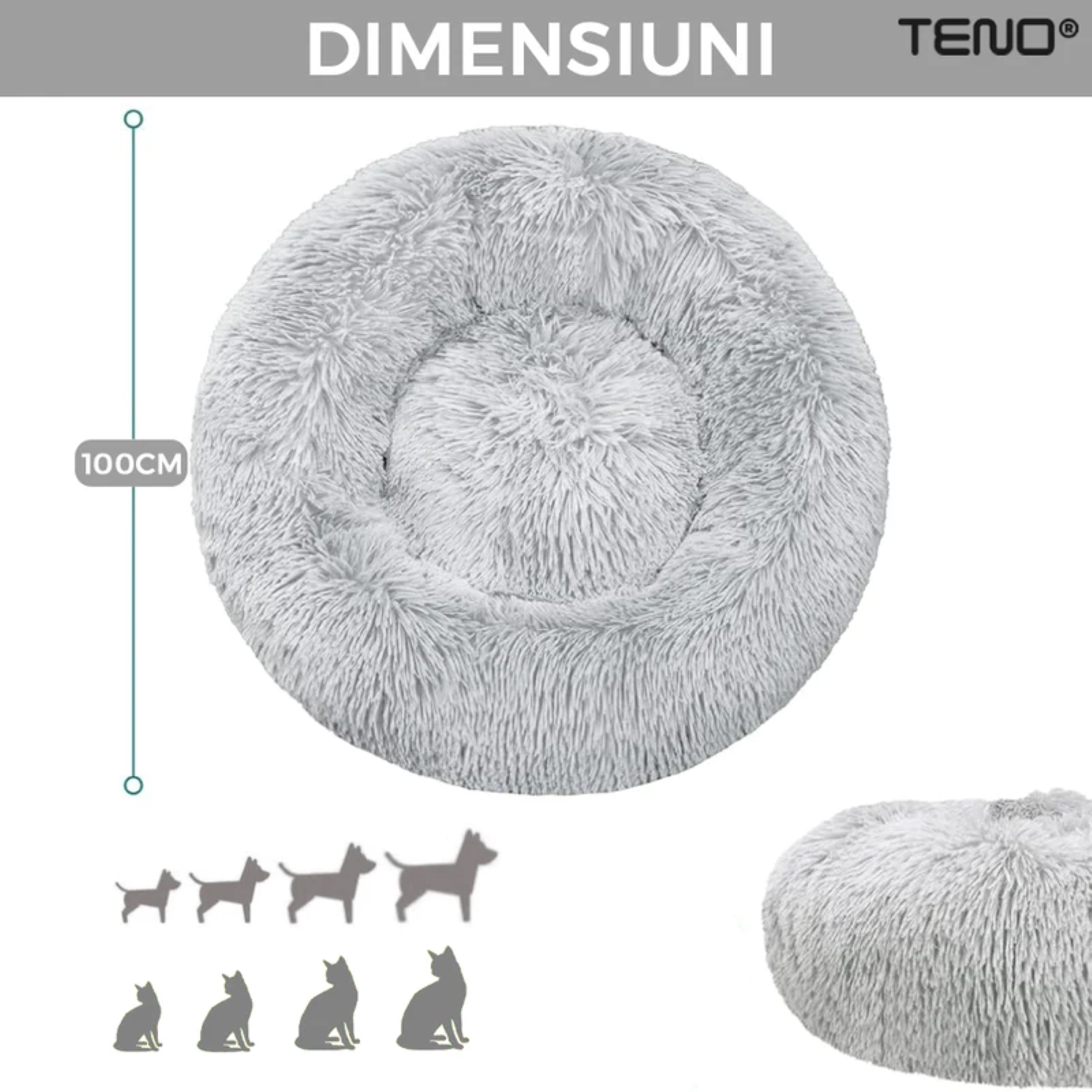 - Dimensiuni generoase: Cu un diametru de 100 cm, patul oferă suficient spațiu pentru ca animalul tău să se întindă și să se relaxeze.