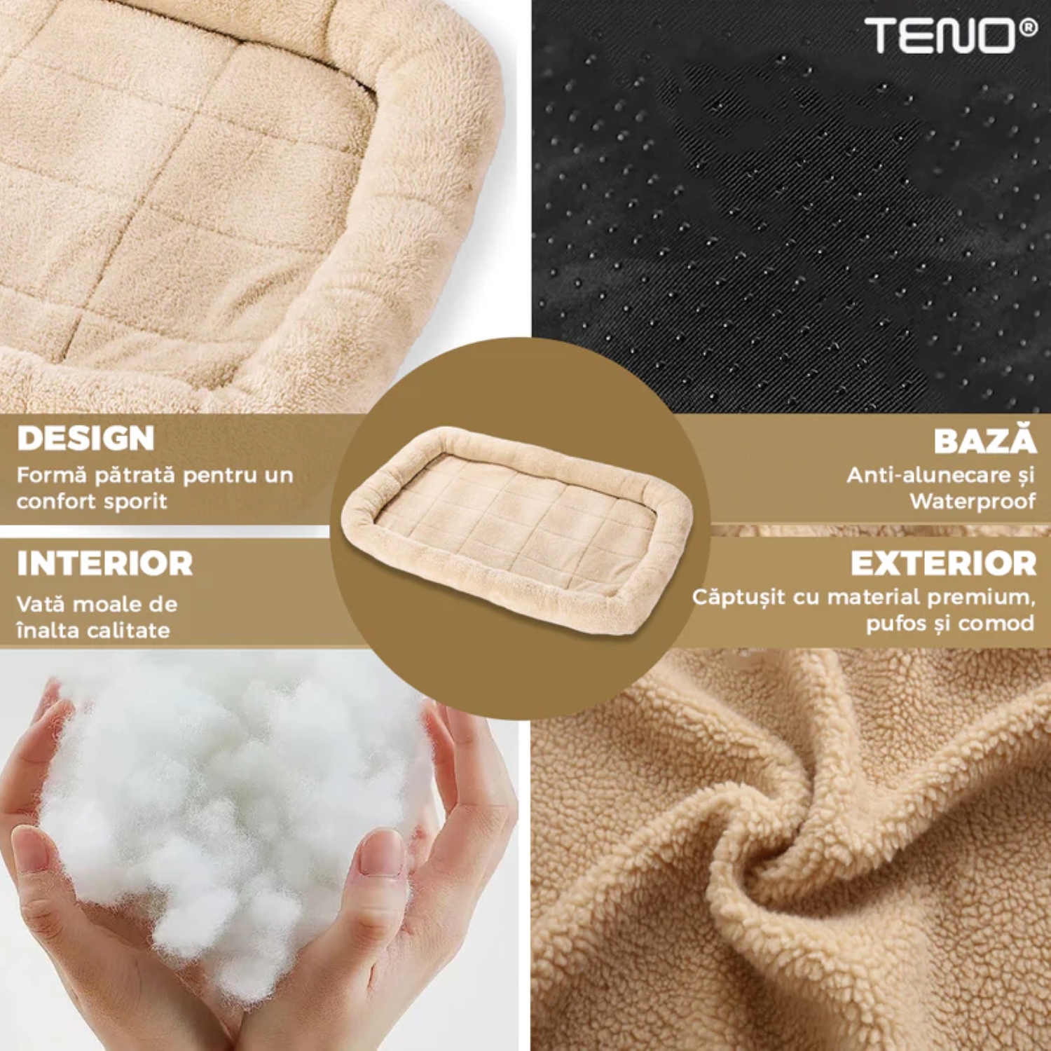 - Baza anti-alunecare: Împiedică patul să se deplaseze pe podea, oferind animalului tău o stabilitate optimă în timpul somnului.